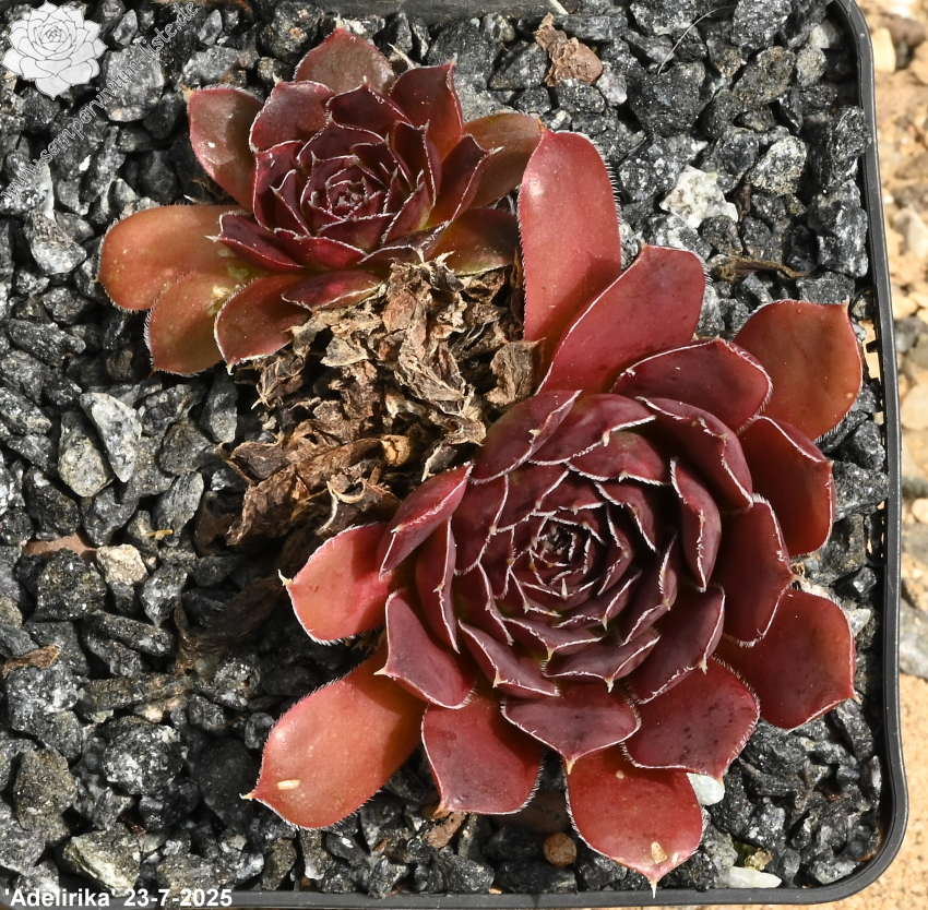 Mit Jovibarba heuffelii 'Adelirika' haben wir eine schön gefärbte Züchtung von André Smits im Sortiment. Die schönsten Farben zeigen die Pflanzen in den Sommermonaten, wie man auf den Bildern sehen kann. Sie bilden wüchsige Rosetten, die einen Durchmesser von etwa 9 cm erreichen können. Gerne werden die gelben Blüten von Hummeln besucht. Wie bei allen Jovibarba heuffelii ist die Vermehrung langwierig!