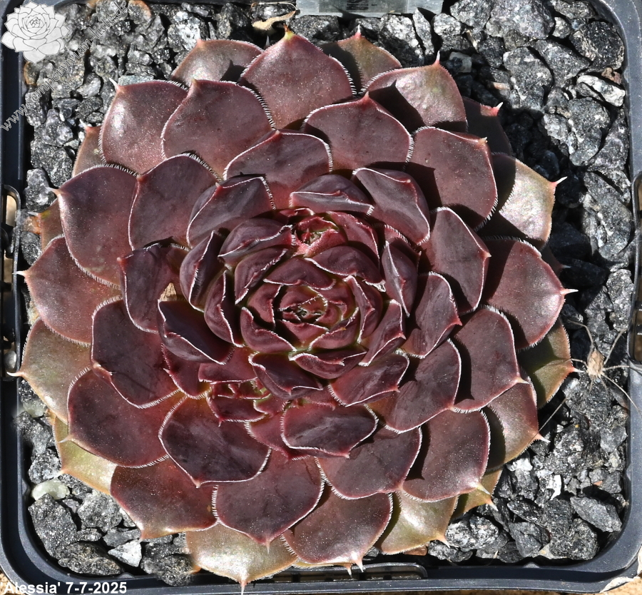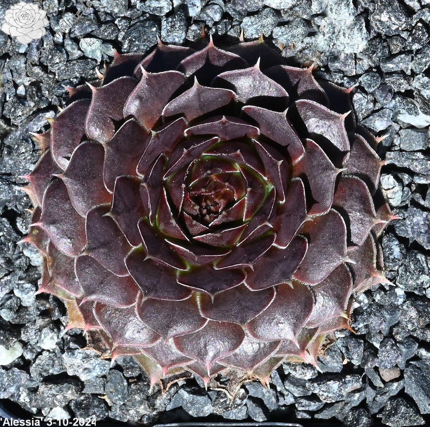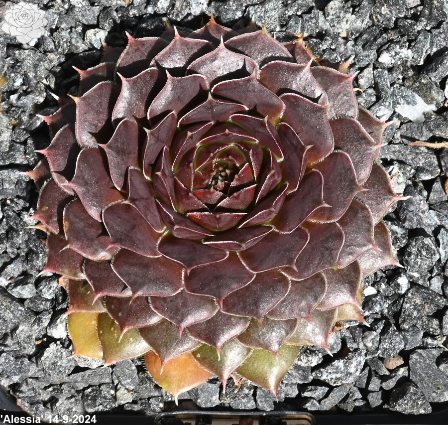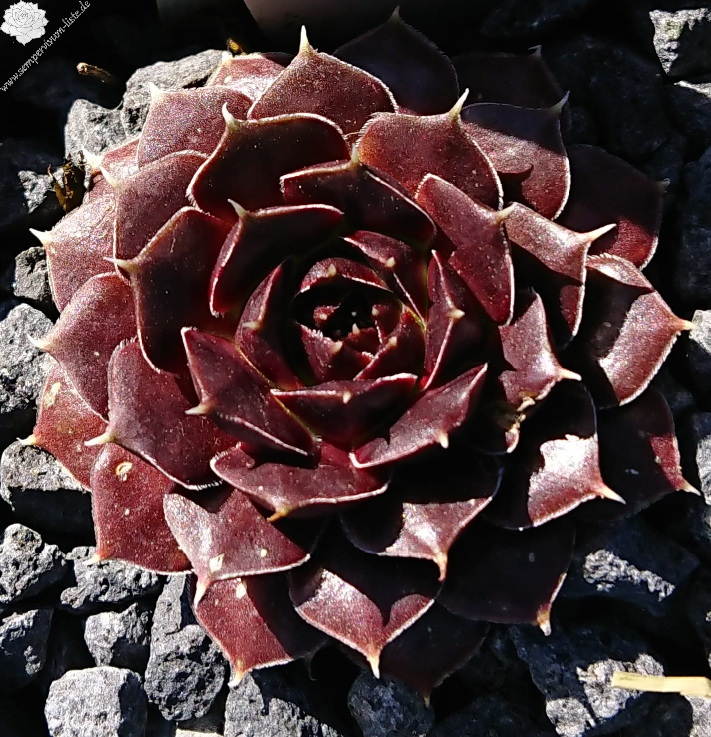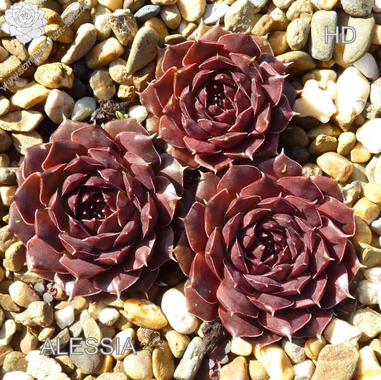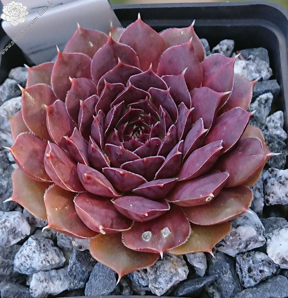 kleine Rosetten, kurze keilförmige Blätter, kurz bespitzt, dunkles Weinrot