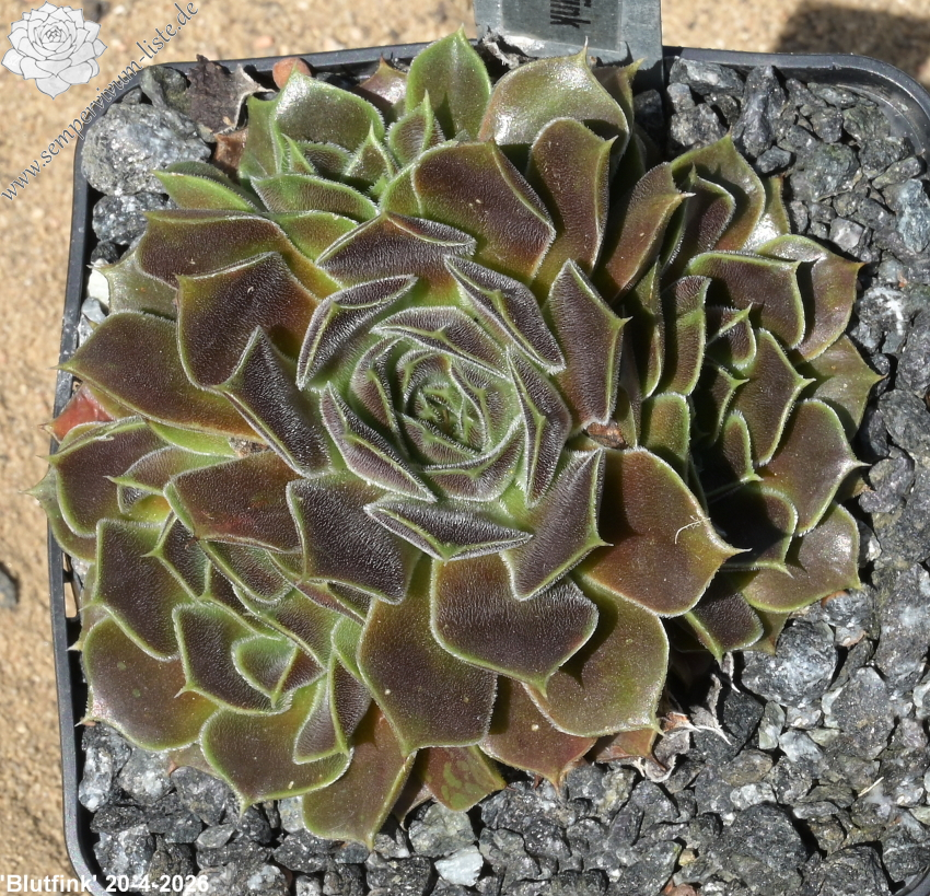 Rosetten bis 6cm, Blätter spatelig, kurz bespitzt, rotviolett, Blattränder mit hellem Streifen , bewimpert