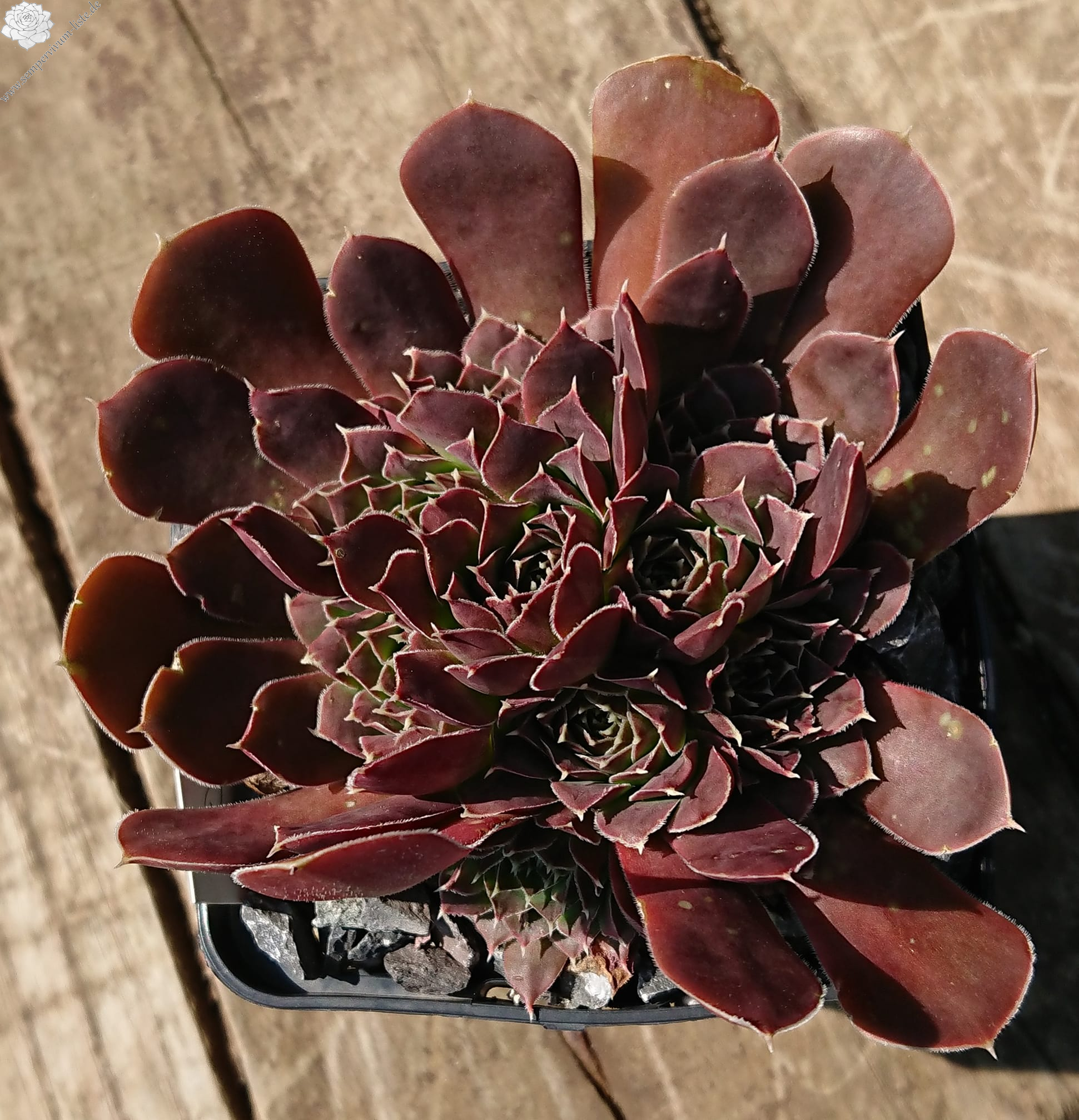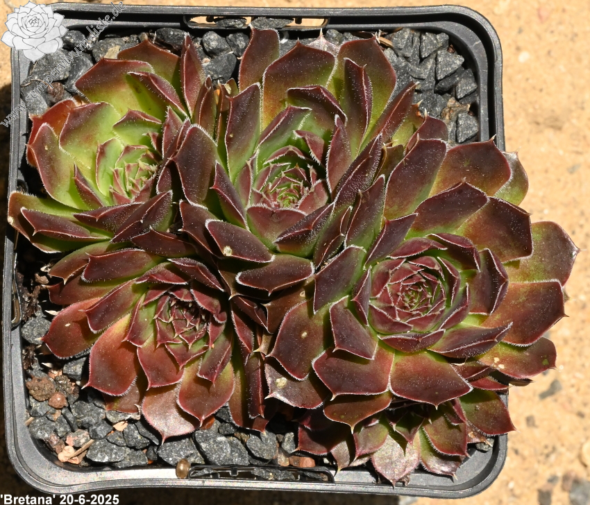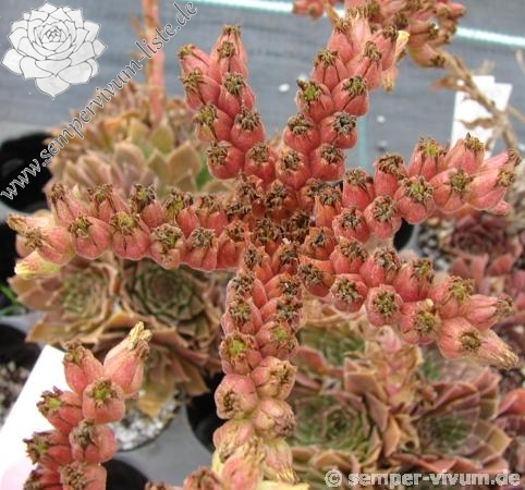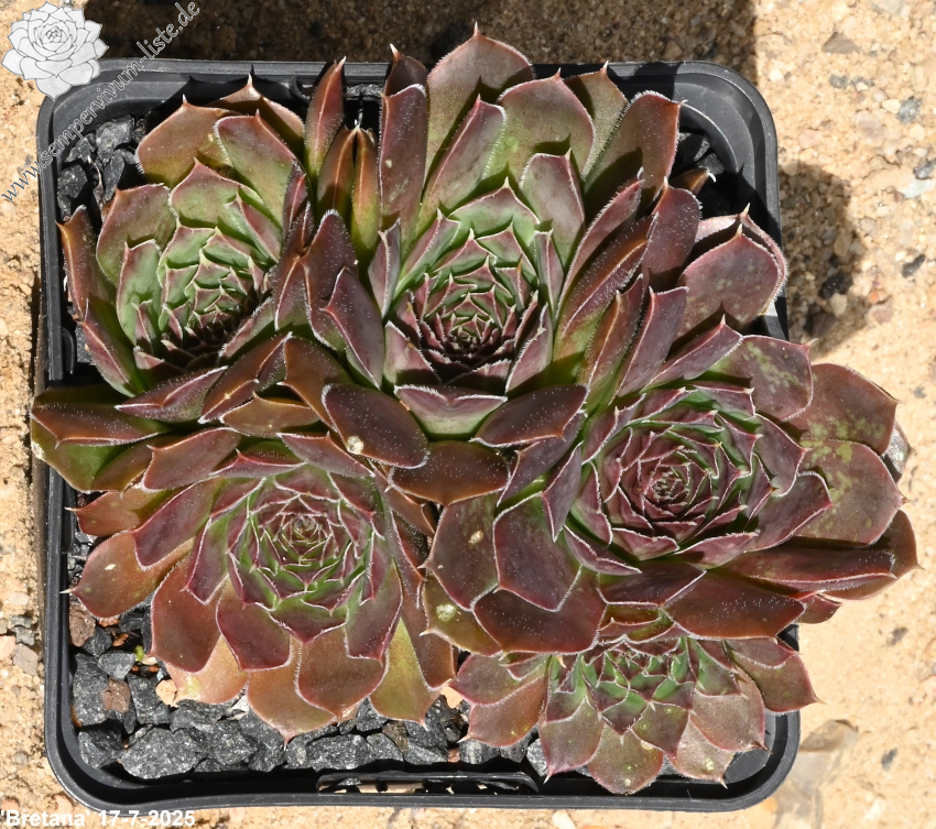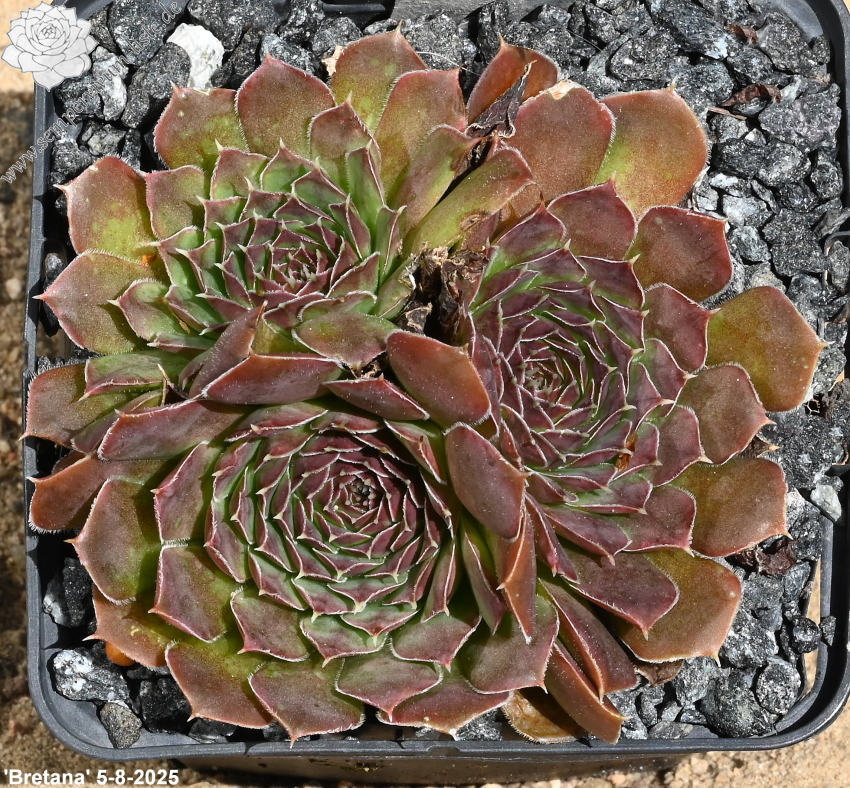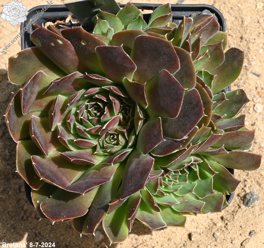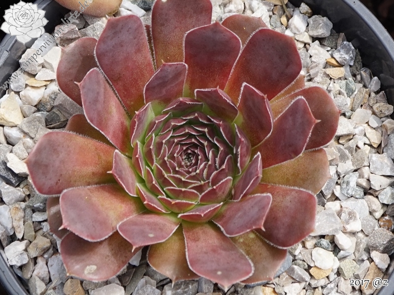 Eine selten anzutreffende Hybride von Martin Haberer: Flache, ca. 5 cm große Rosetten in seltsamer Färbung. Der Züchter schreibt von Rosa. Wenn man sie ganzjährig betrachtet, so sind sie eher Braun gefärbt. Vor allem in Frühjahr auffallend mit Rosa, je nach Jahreszeit auch mit Grün vermischt. Besonders gut gefällt uns die Form, die durch die ungewöhnlich breiten Blätter entsteht.