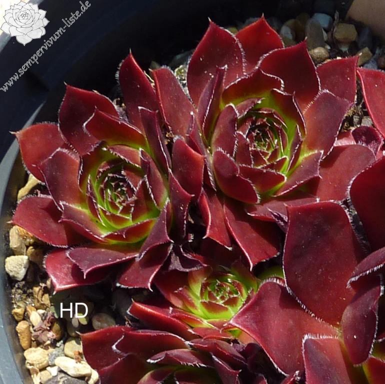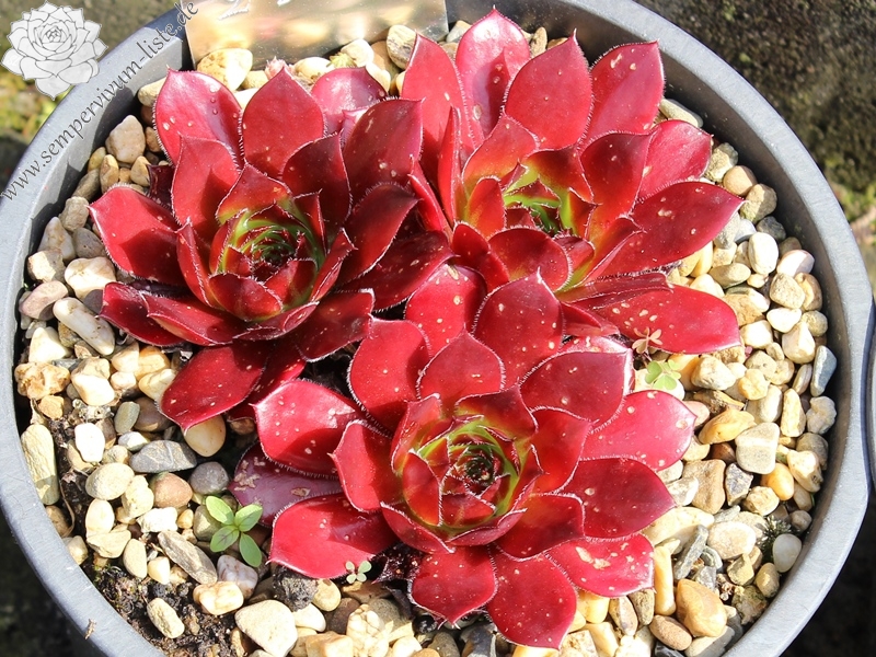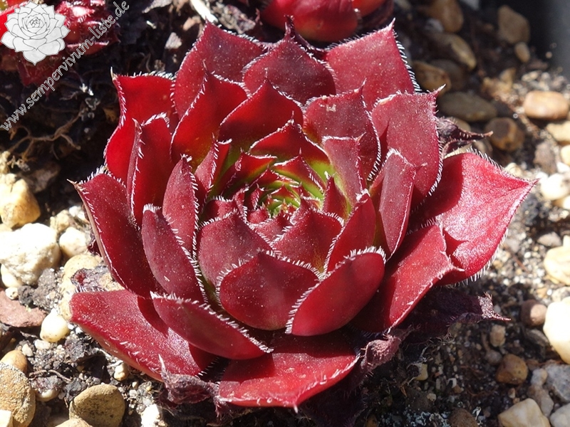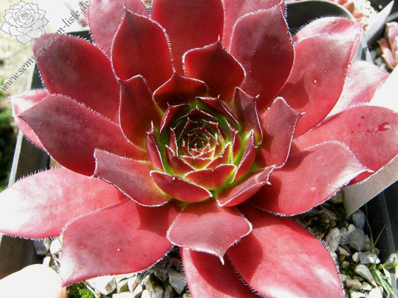 Rosetten bis 8 cm, leuchtendes Blutrot, Herz hellgrün, Blattränder zart hell bewimpert