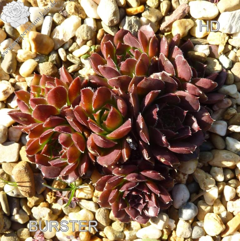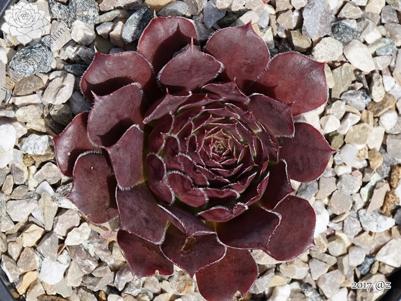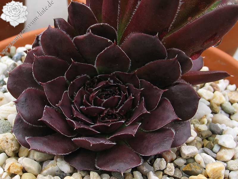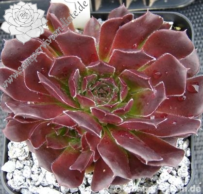 Der rotbraune Kultivar stammt aus Deutschland und formt auffallend attraktive Rosetten: Die glatten Blätter sind am Rand weiß bewimpert und besitzen eine deutlich aufgesetzte Spitze. Die Färbung des Zentrums wechselt zum Sommer zu leuchtendem Smaragdgrün.