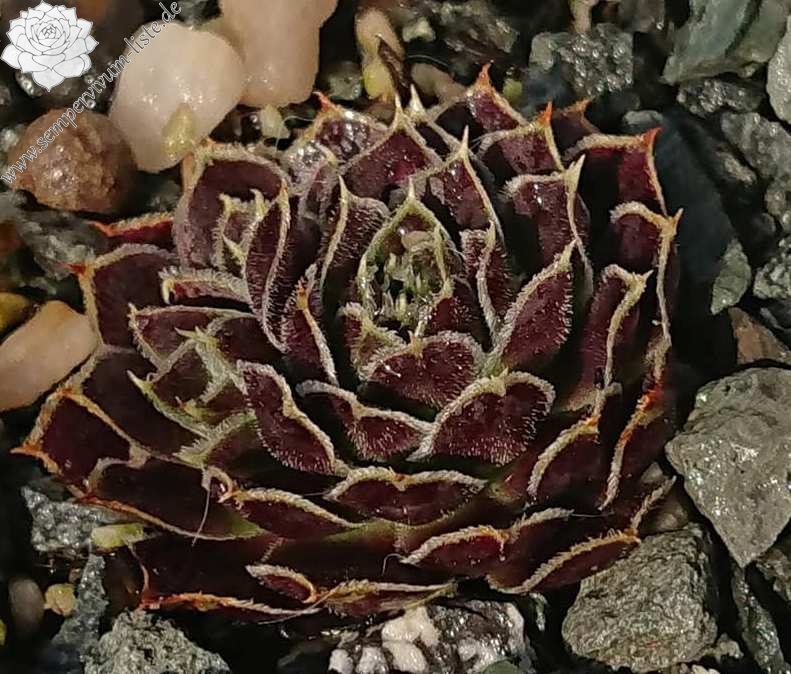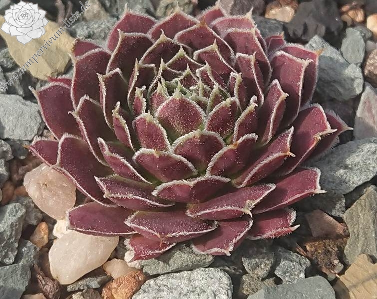 Rosetten bis 8 cm, Blätter oval, kurz bespitzt, signalviolett - purpurviolett, Blattränder grünlich, silbrig bewimpert