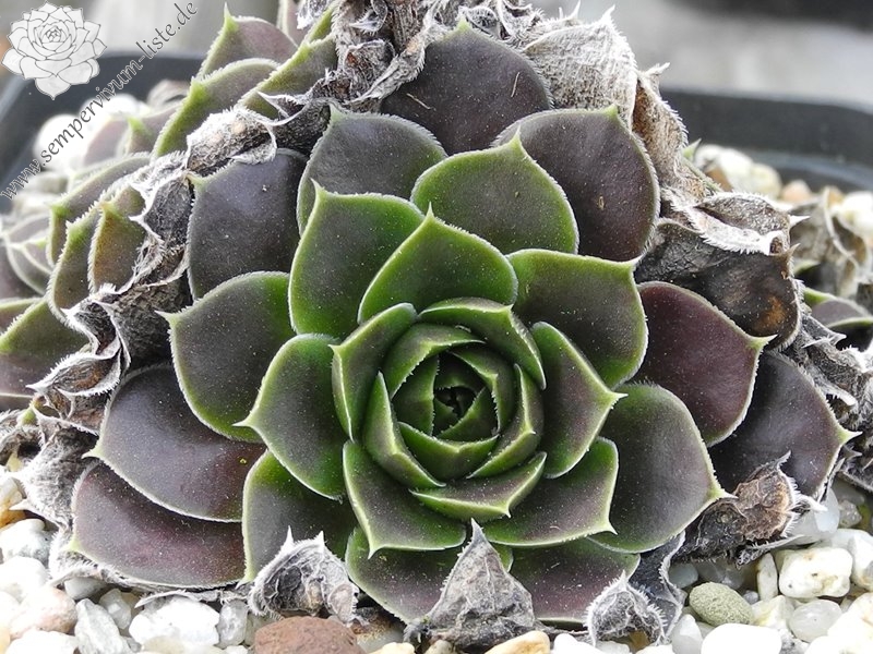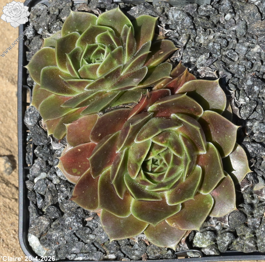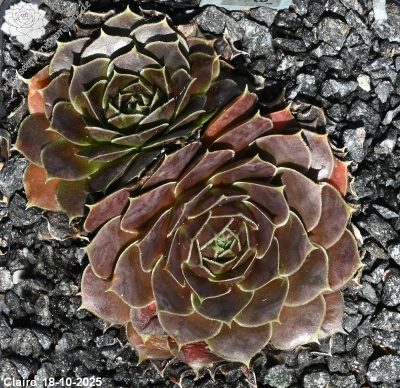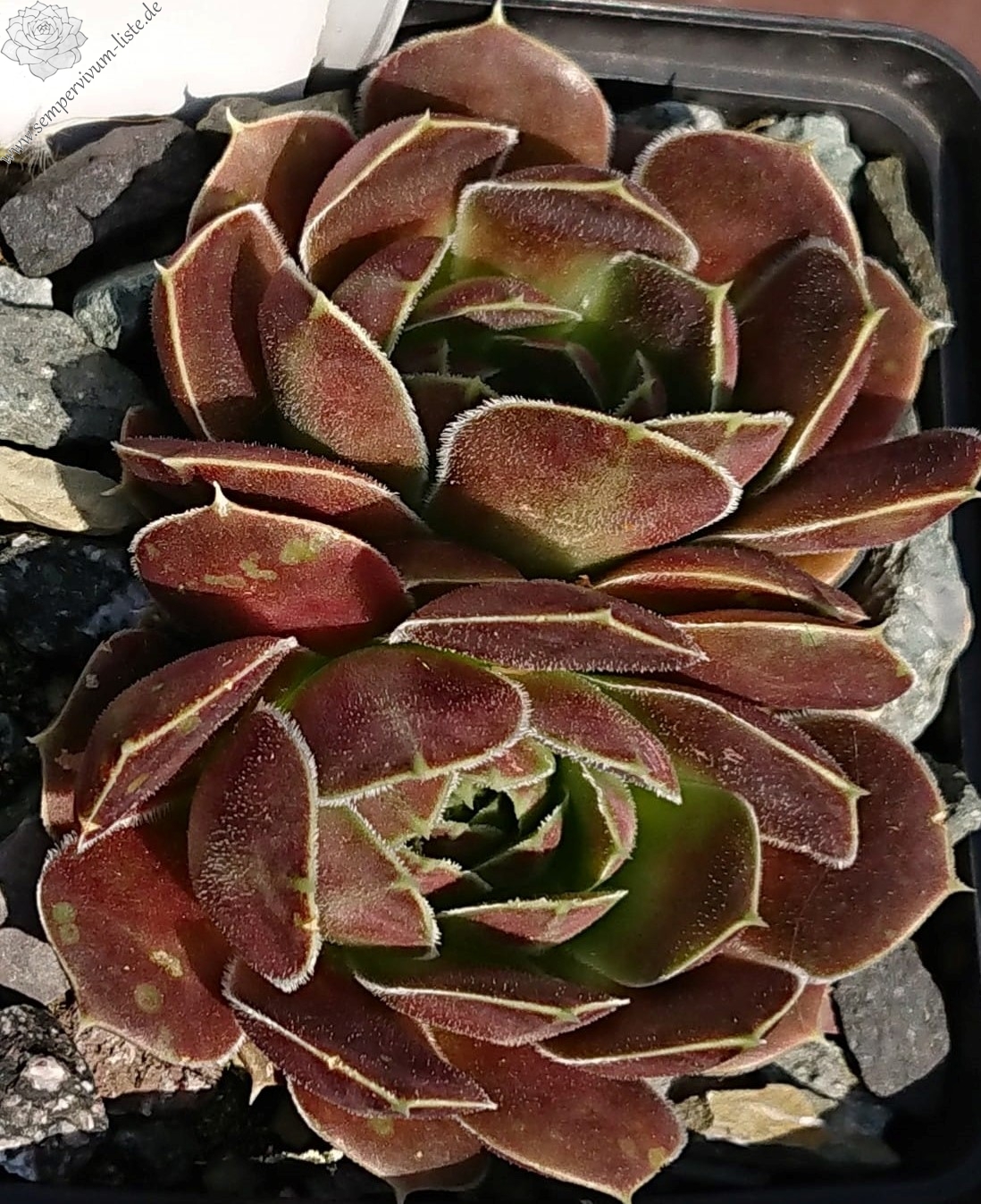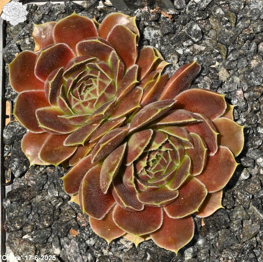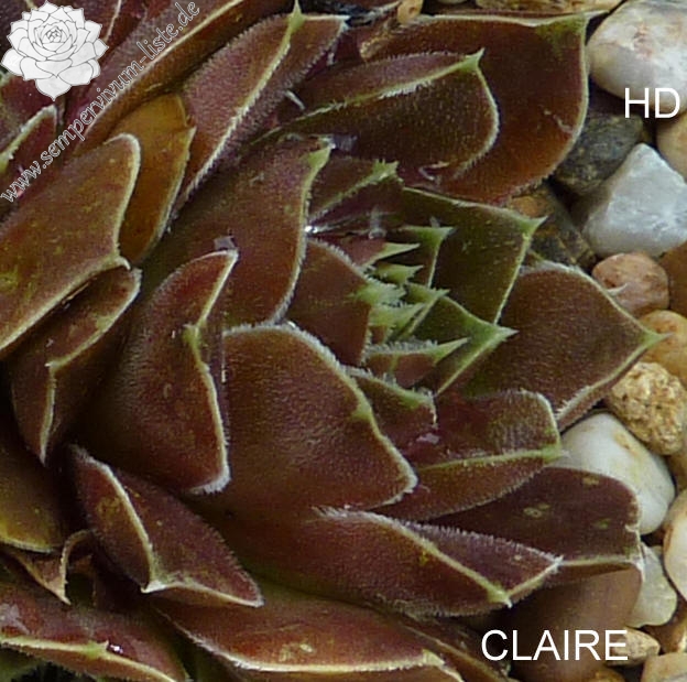 Rosetten bis 6 cm, samtige Substanz, Blätter oval, lang bespitzt, Basis helles Grün, Rest dunkles Braunrot, Blattränder grünlich, bewimpert