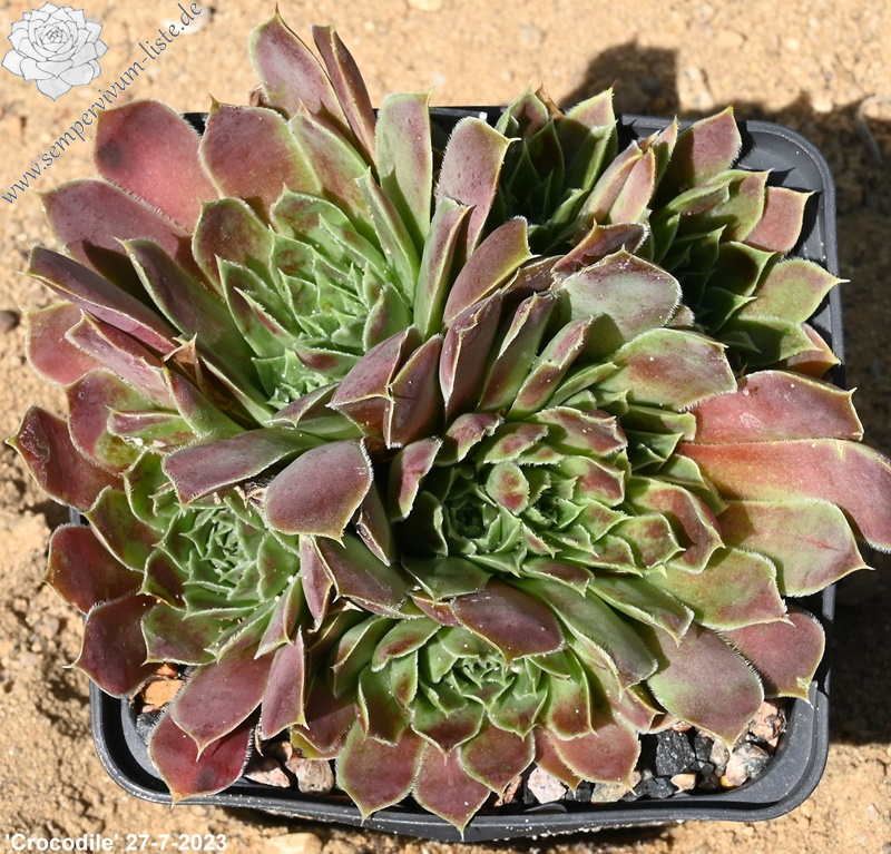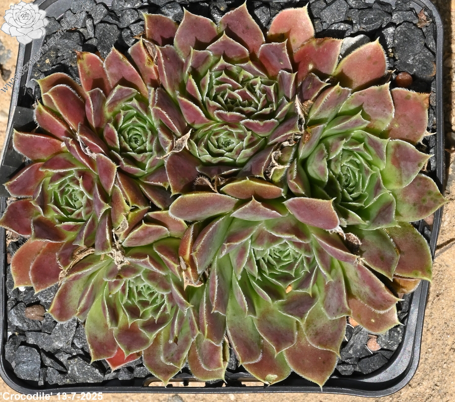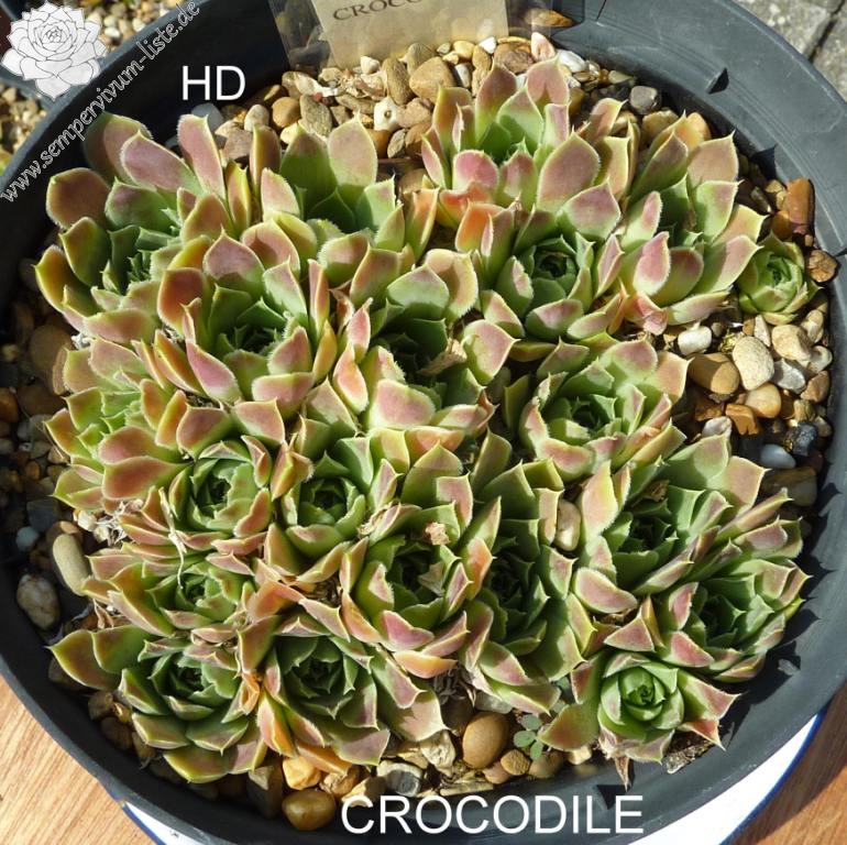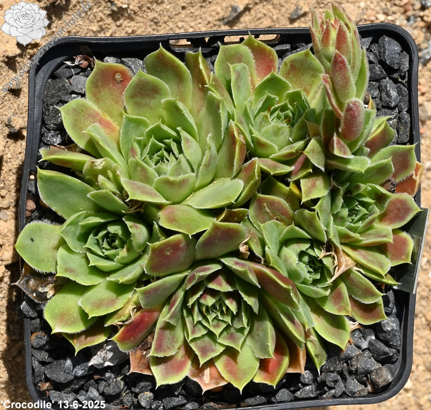 Die Sorte formt mittelgroße Rosetten in jadegrünem Pastell mit lachsrosa Frühjahrsfärbung.