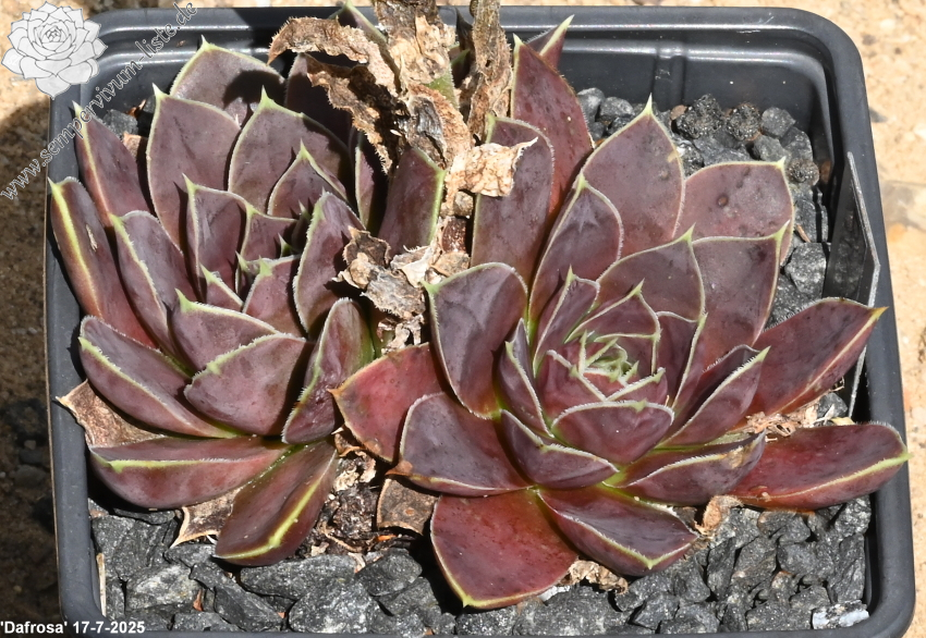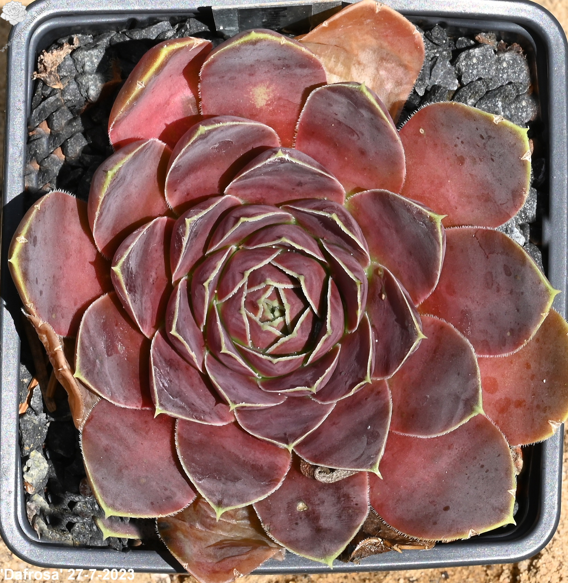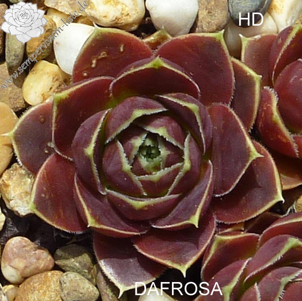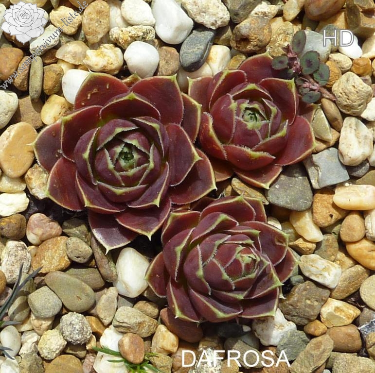 kleine Rosetten, Blätter eiförmig, kurz bespitzt, dunkles Rotbraun, Blattränder gelb