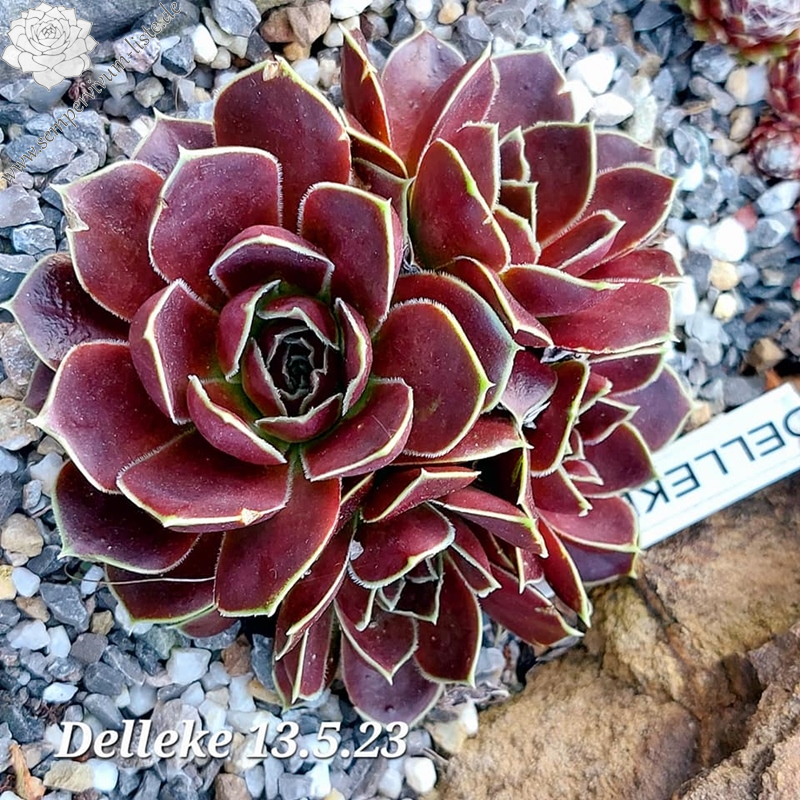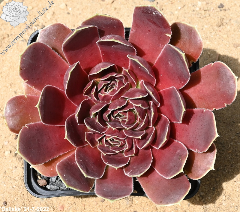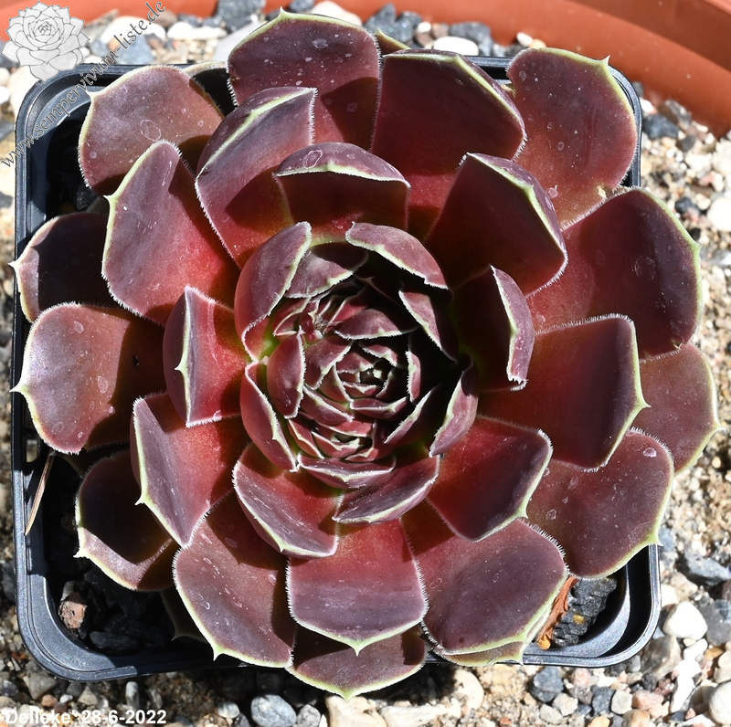 Rosetten bis 6 cm, Blätter rundlich, kurz bespitzt, purpurrot - weinrot , Blattränder gelblich