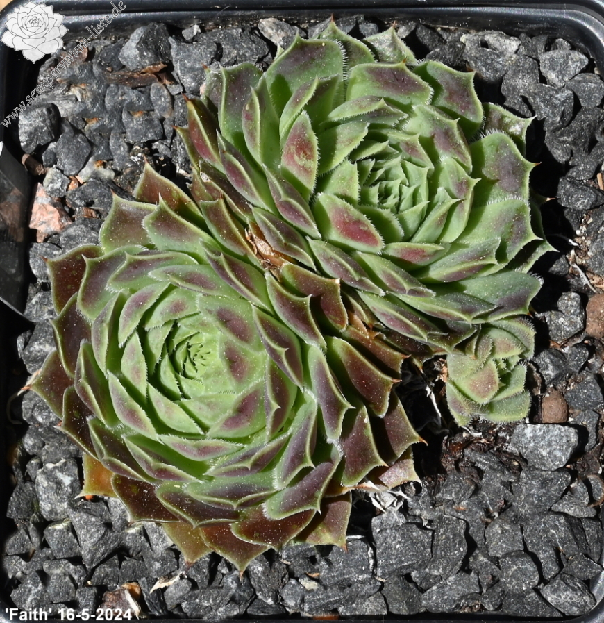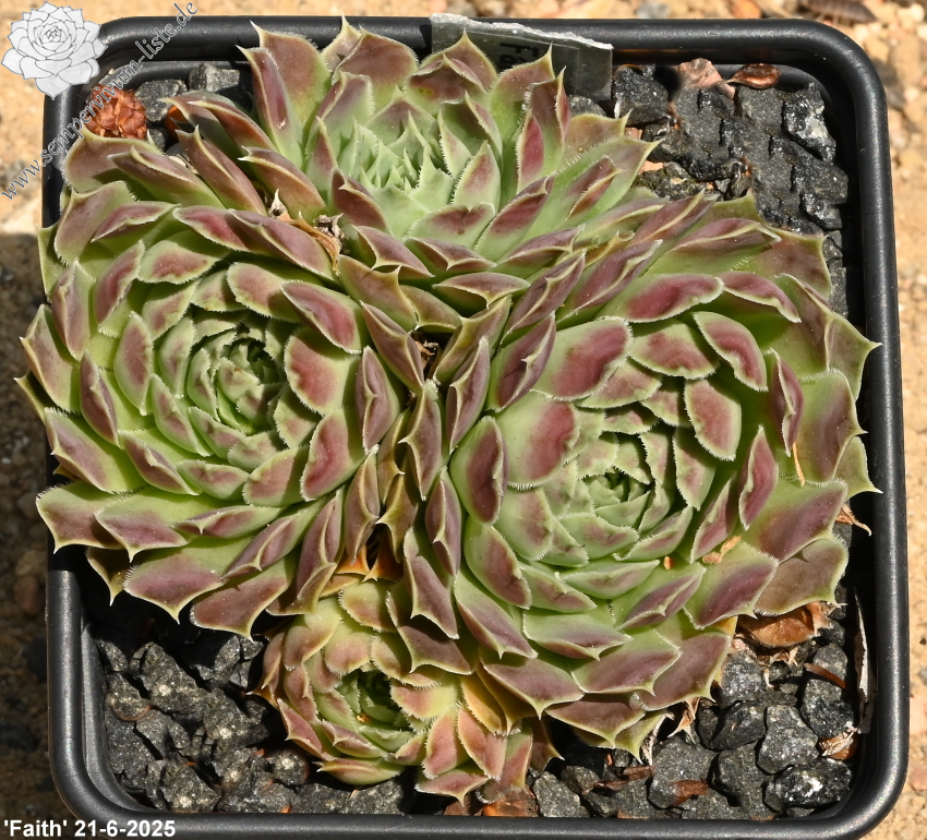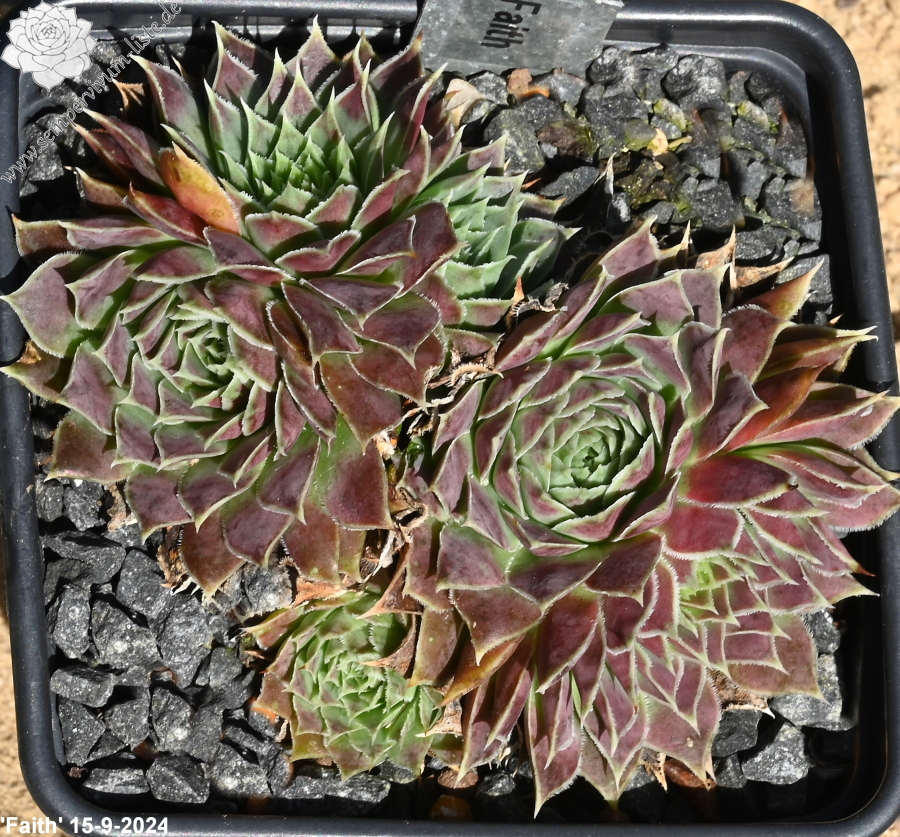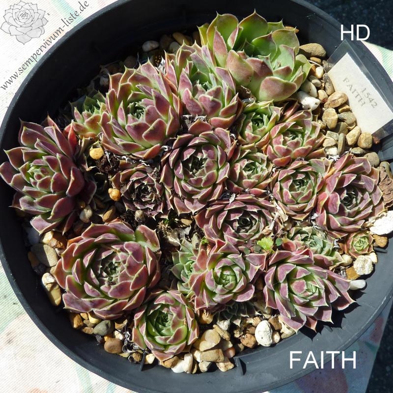 Der Donarsbart 'Faith' gehört zur Gruppe der kleinrosettigeren Hybriden. Ein gemischter Farbton aus Grün und bräunlichem Violet. Eine amerikanische Sorte die Ende der 90er Jahre ausgelesen wurde.