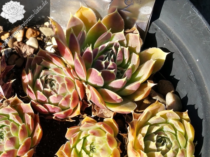 kleine Rosetten, Blätter eiförmig, lang bespitzt, Basis hellgrün, Rest braun - rot