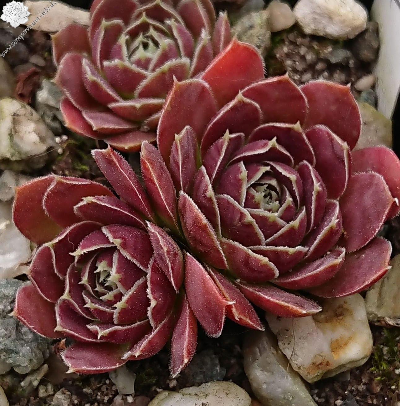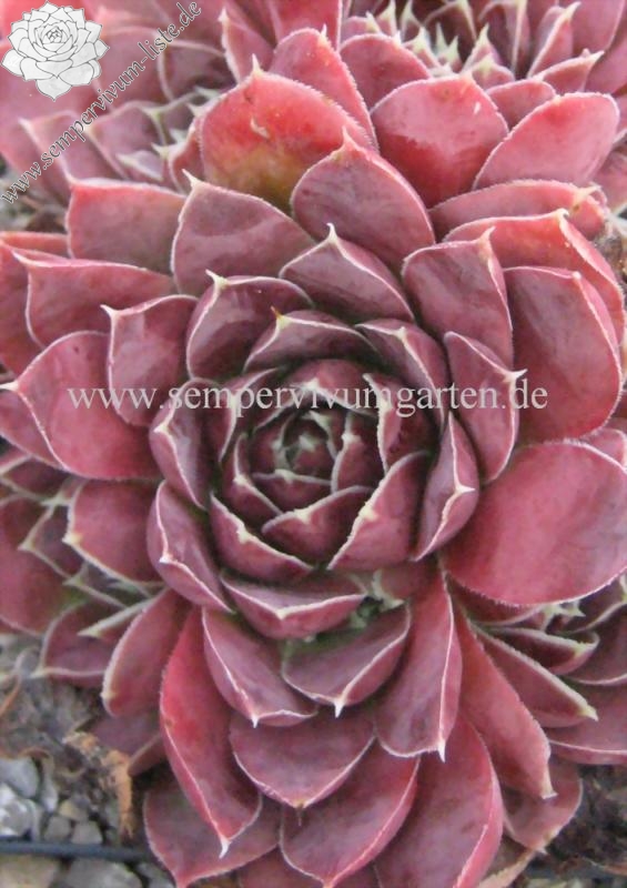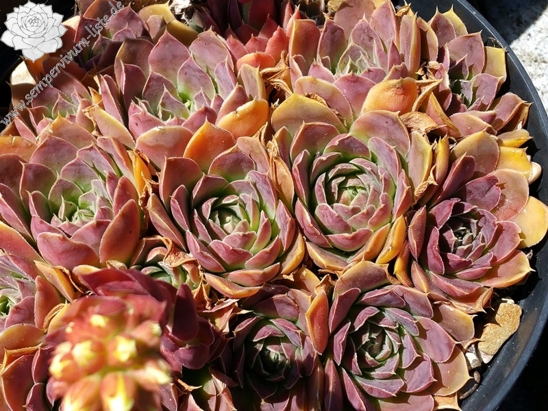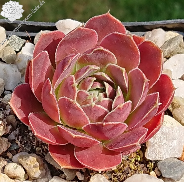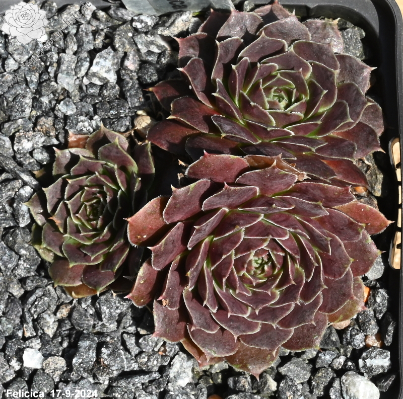 Rosetten bis 6 cm, Blätter oval, kurz bespitzt, dunkelbraun - rot, helle Blattränder