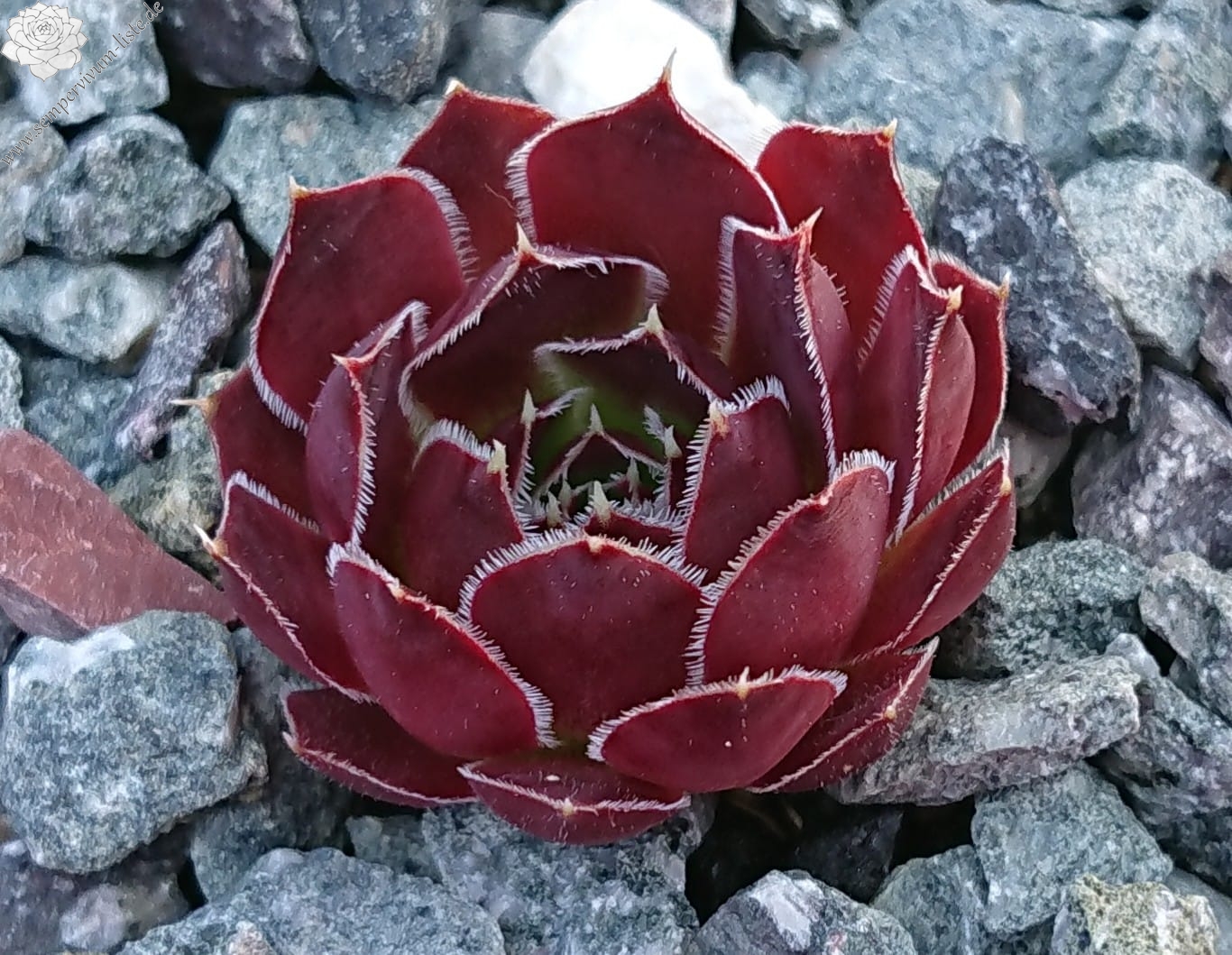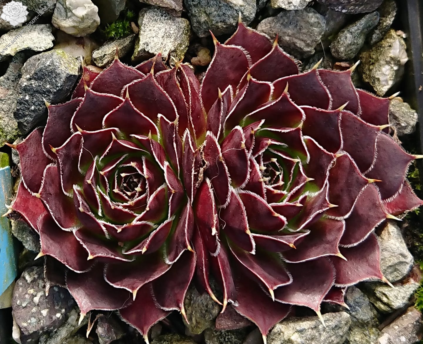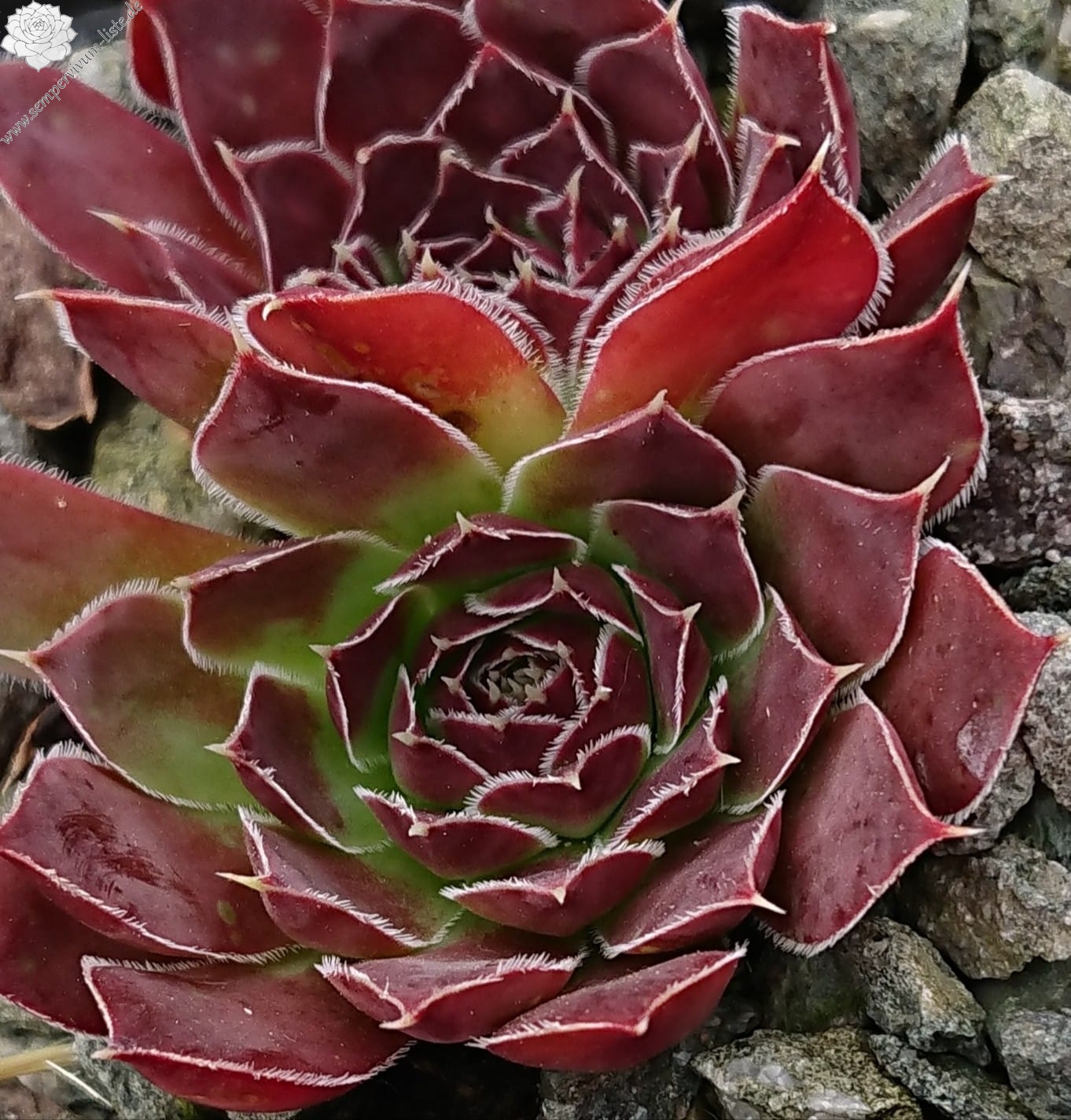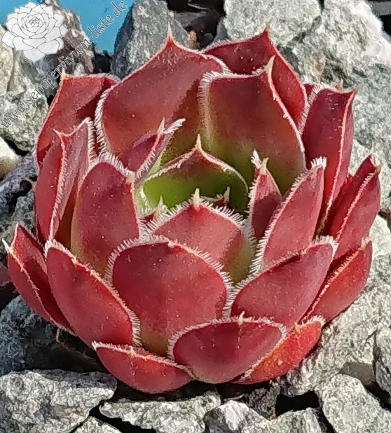 kleine Rosetten, Blätter breit keilförmig, kurz bespitzt, weinrot - himbeerrot, Blattränder bewimpert