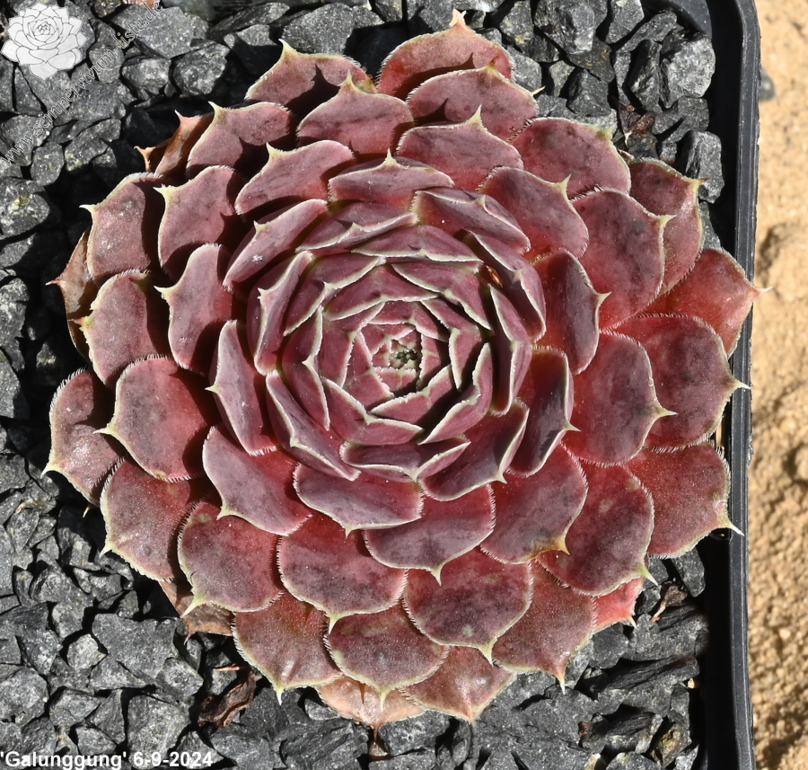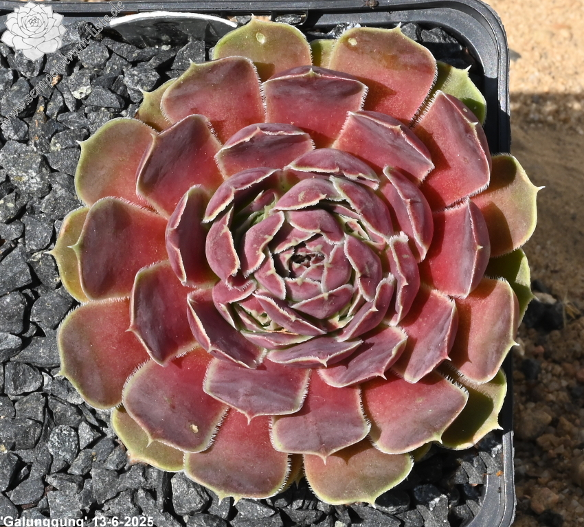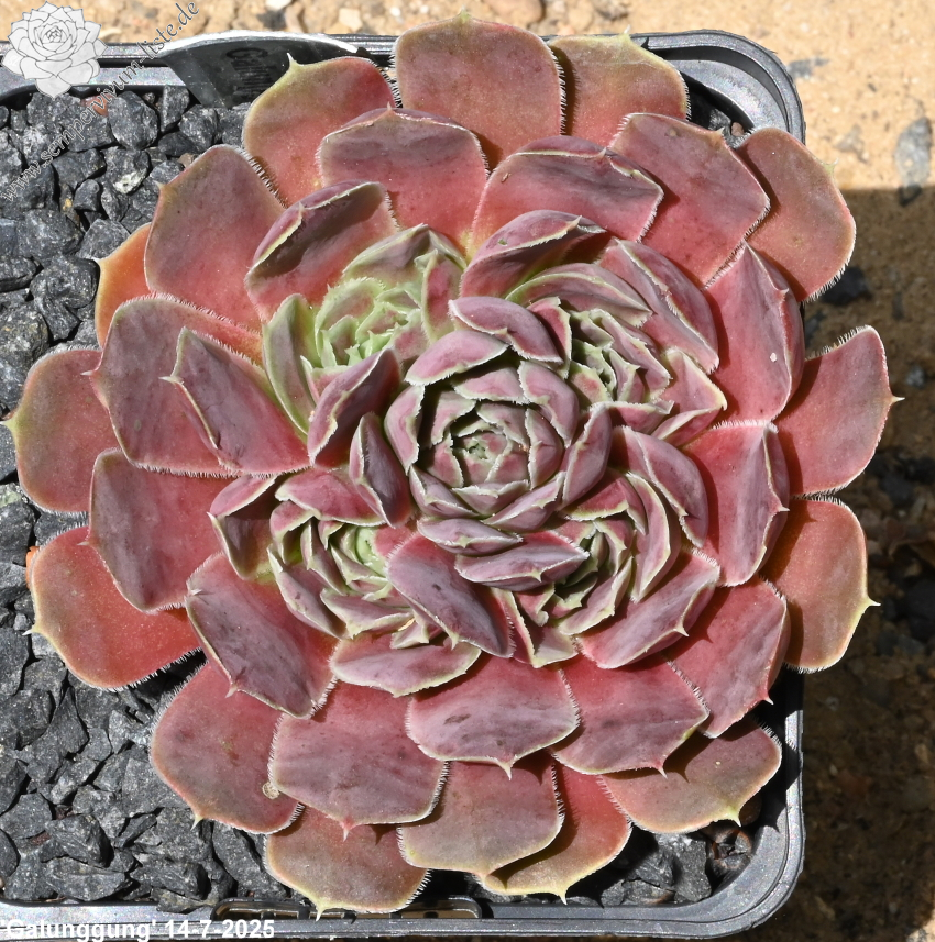 Rosetten bis 6 cm, spatelige Blätter, kurz bespitzt, Herz blassgrün, Rest bordeauxviolett, Blattränder grün, bewimpert