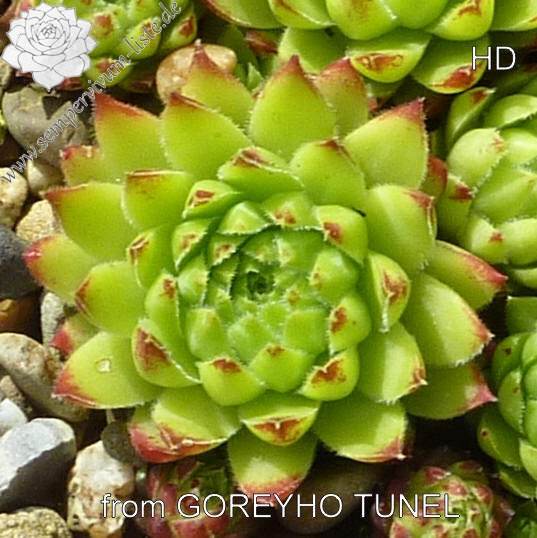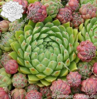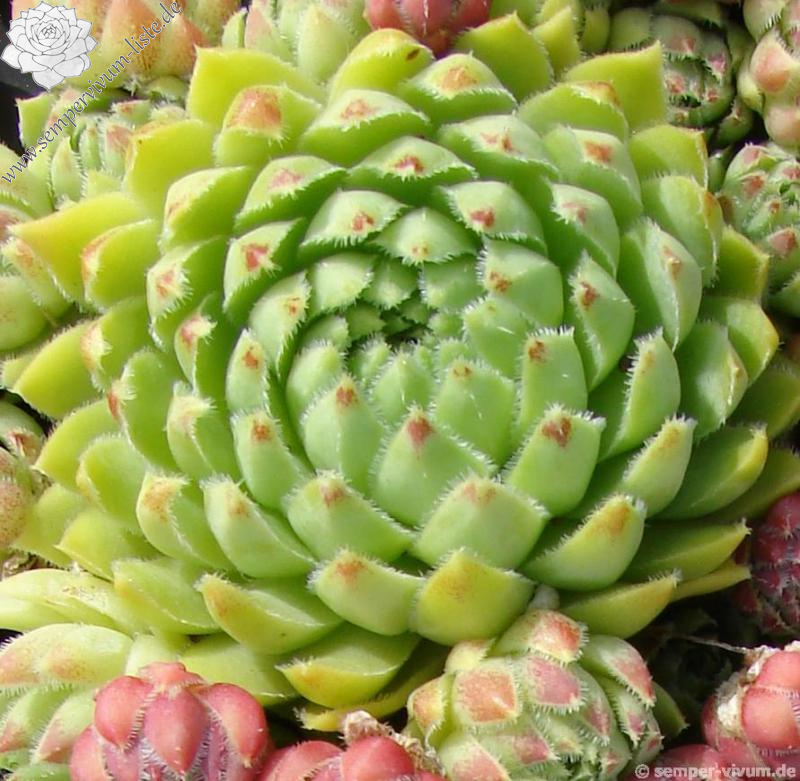 Erwin Geiger: Eine tolle Kontrastpflanze mit gelblich jadegrünen Rosetten und auffallend weiß bewimperten Blatträndern. Die kugeligen Tochterrosetten färben sich zudem ab August rosarot. Gefunden in den slowakischen Kremnitzer Bergen bei 1200 m Höhe. PH1472