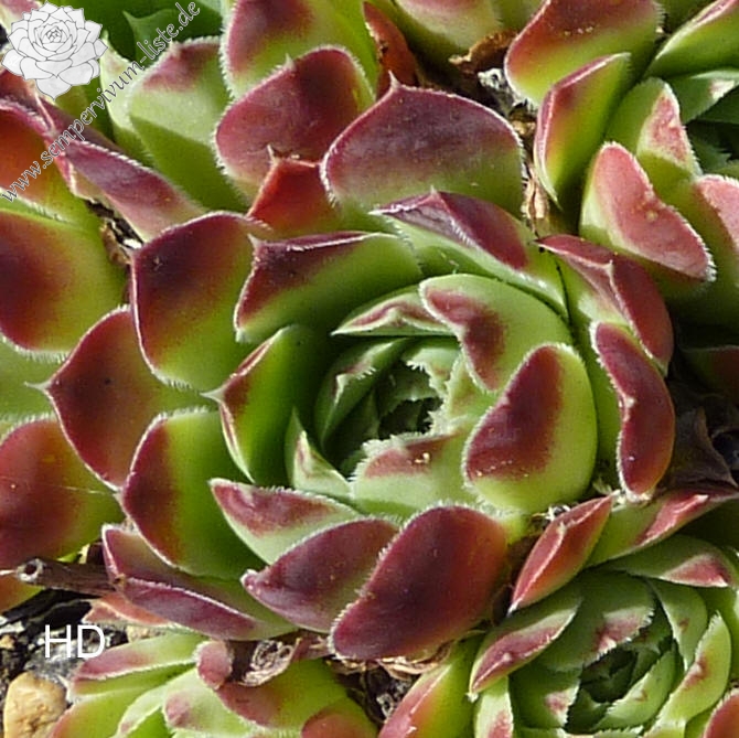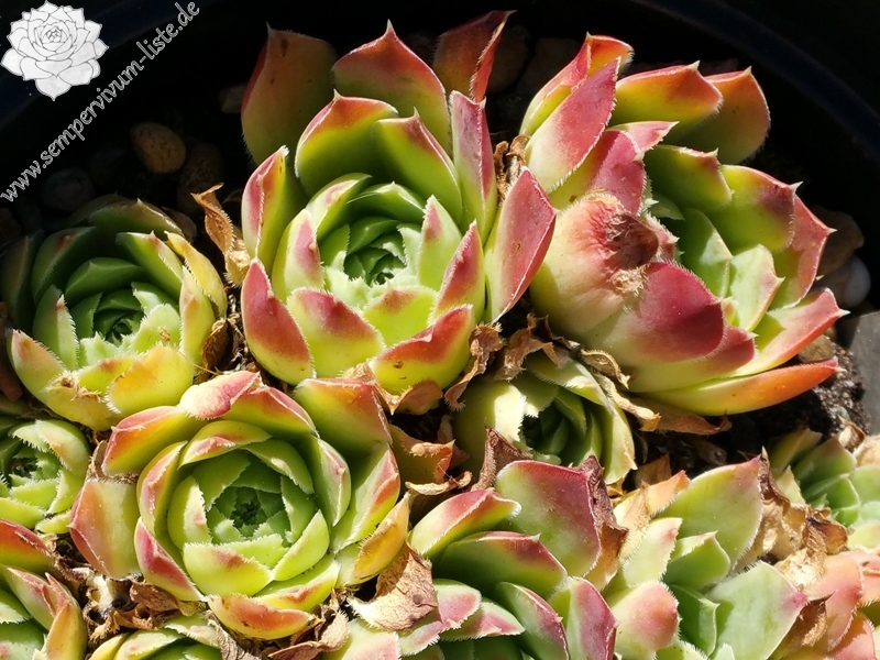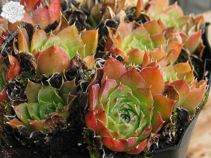 kleine Rosetten, Blätter keilförmig, lang bespitzt, lindgrün, obere Drittel dunkelrot, Blattränder bewimpert