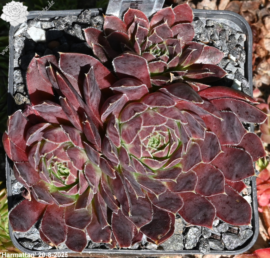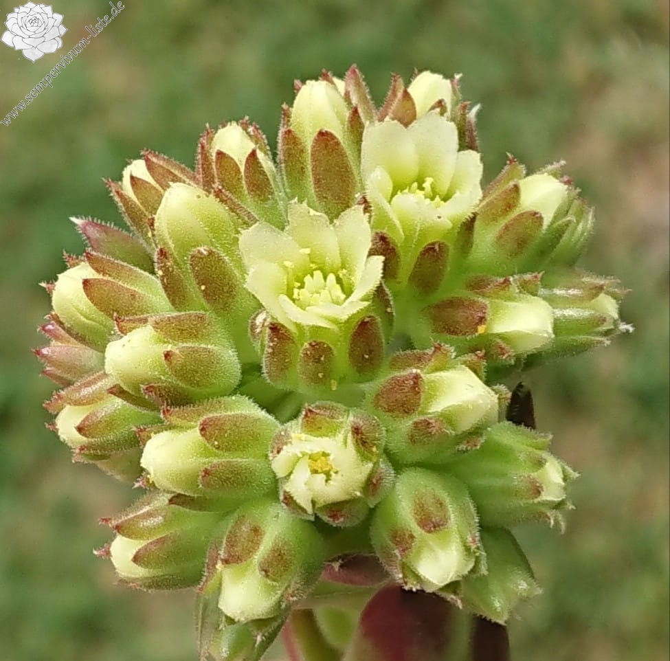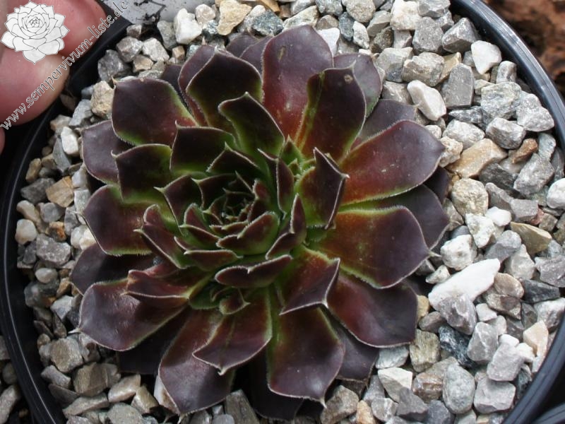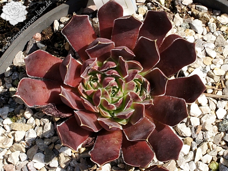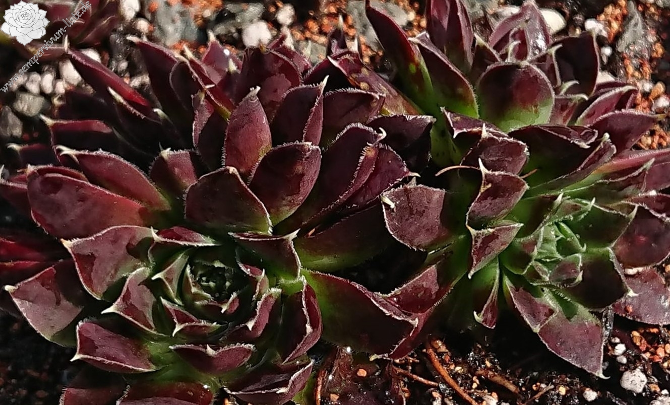 Große Rosetten in rotbraunen Tönen mit leuchtendem hell- bis olivgrünem Zentrum. Durch die weiße Bewimperung der Blätter zeigen sie einen silbrigen Rand.