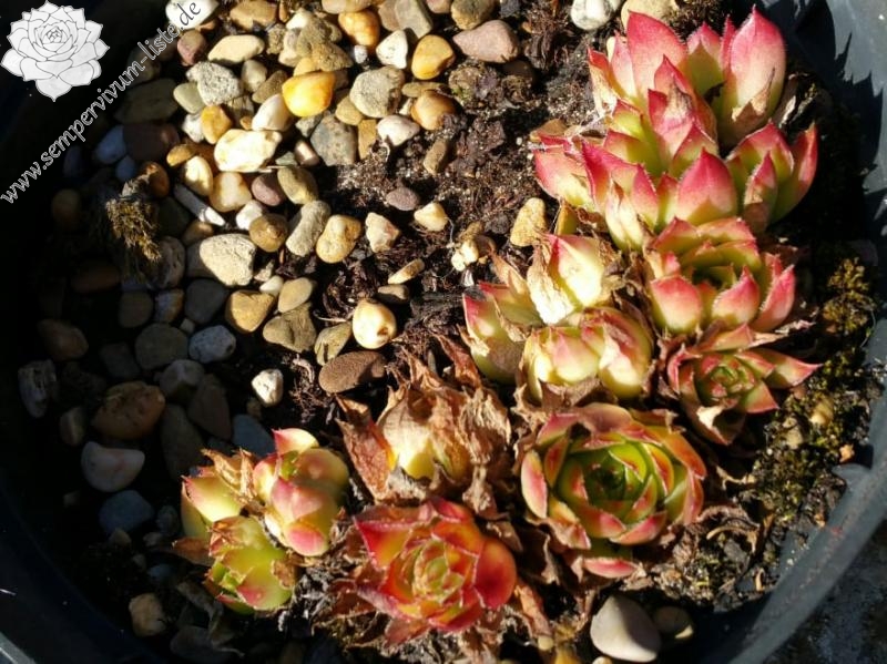 kleine Rosetten, Blätter eiförmig, lang bespitzt, helles Grün, leuchtend rote Spitzen