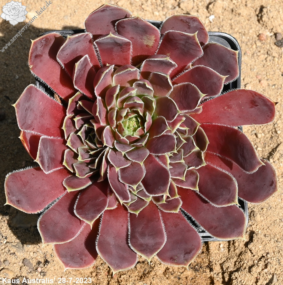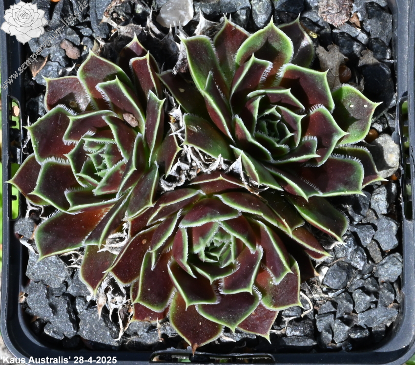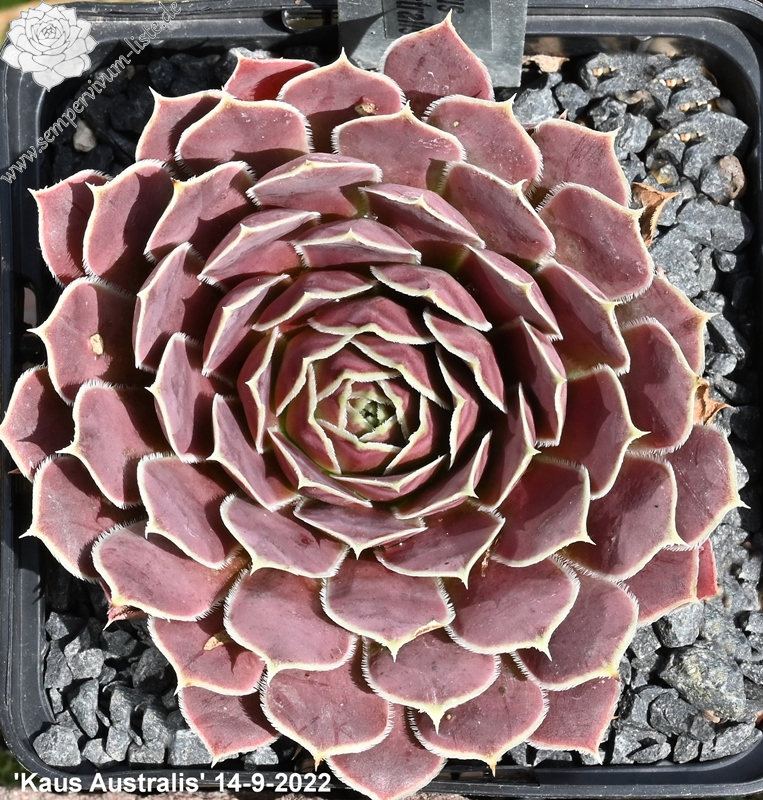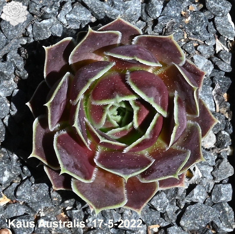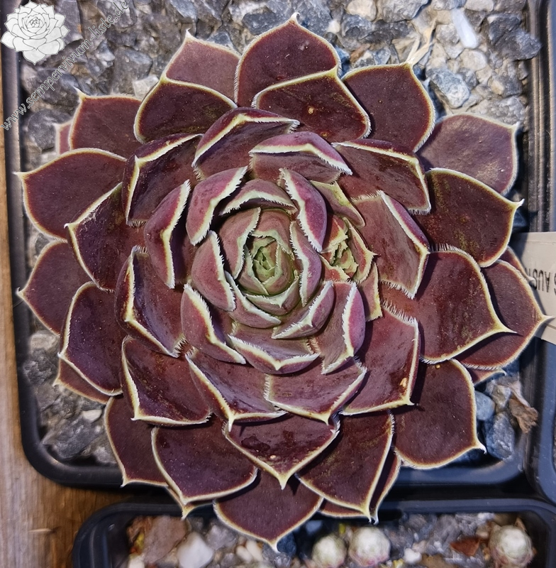 Rosetten bis 5 cm, Blätter breit keilförmig, kurz bespitzt, rotviolett - bordeauxviolett, Basis hellgrün, Blattränder hell, bewimpert