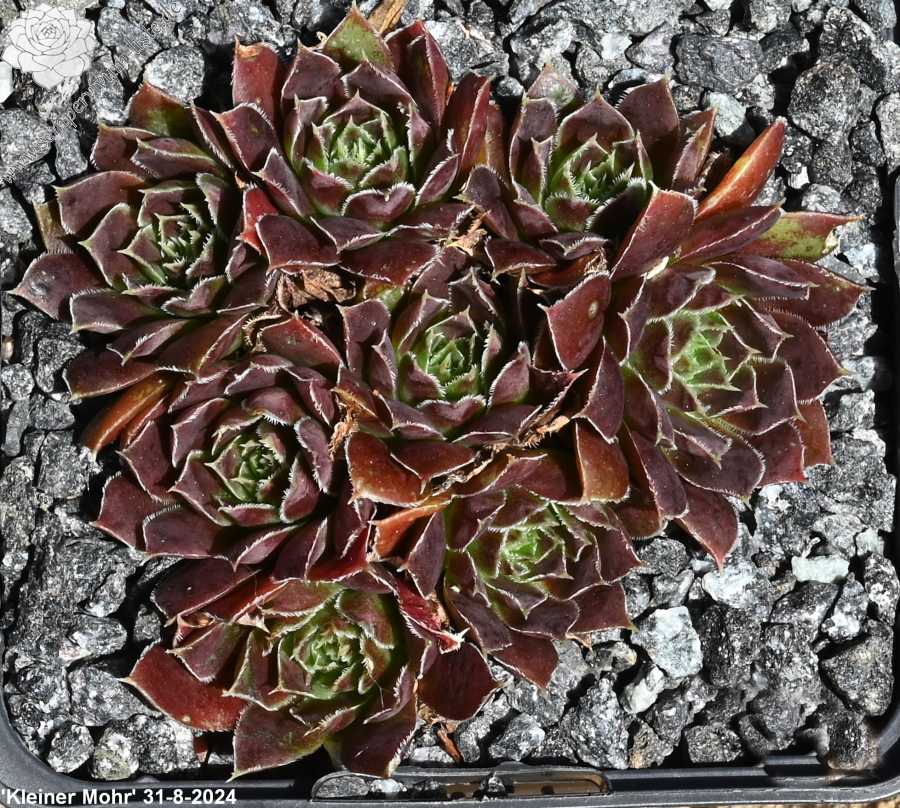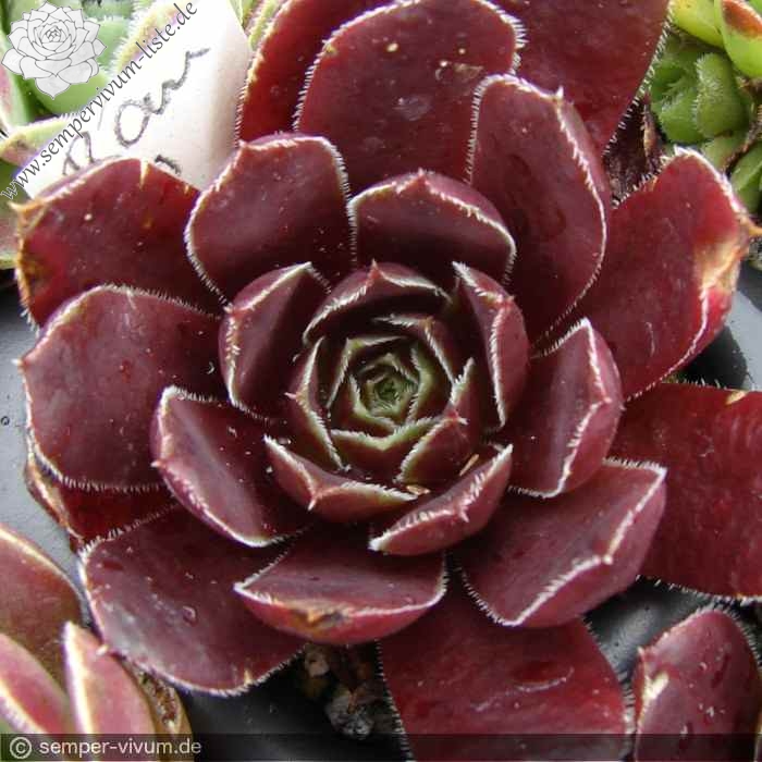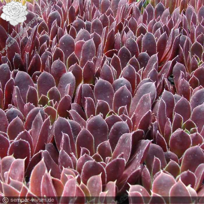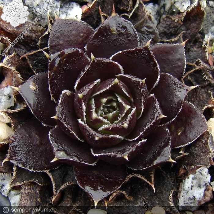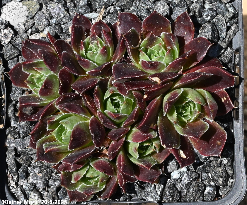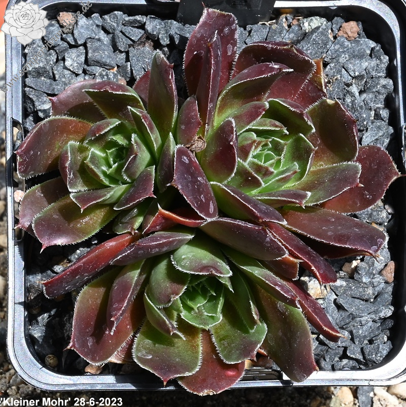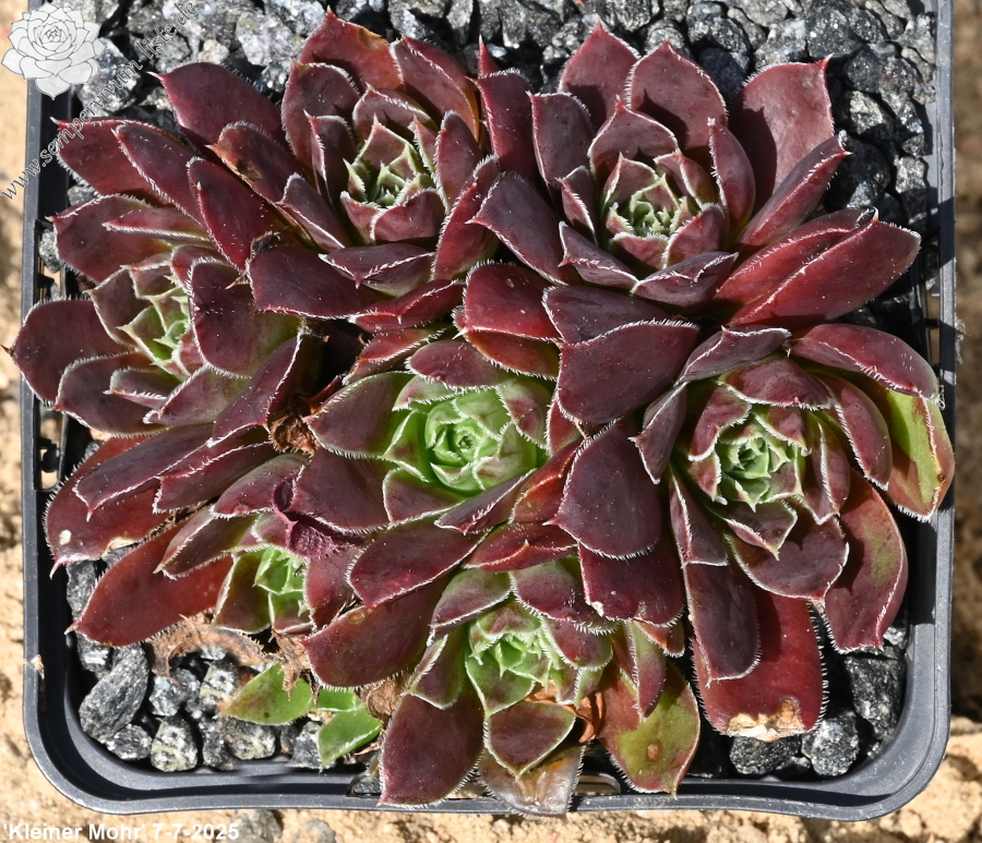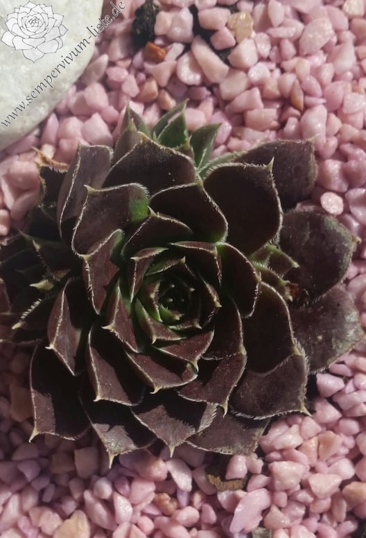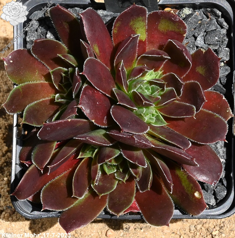 Die dunkelste Färbung zeigen die drei bis vier Zentimeter großen Rosetten ab Oktober. Aber auch schon Ende Juli bis August ein auberginefarbener Vorgeschmack. Ein Sämling und zugleich eine kleinere Ausgabe von 'Schwarzer Peter', wobei wir uns auch hier seit 10 Jahren um ausreichend Nachwuchs kümmern.