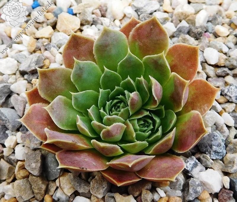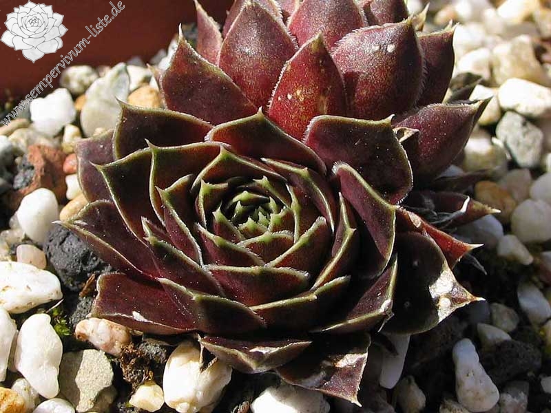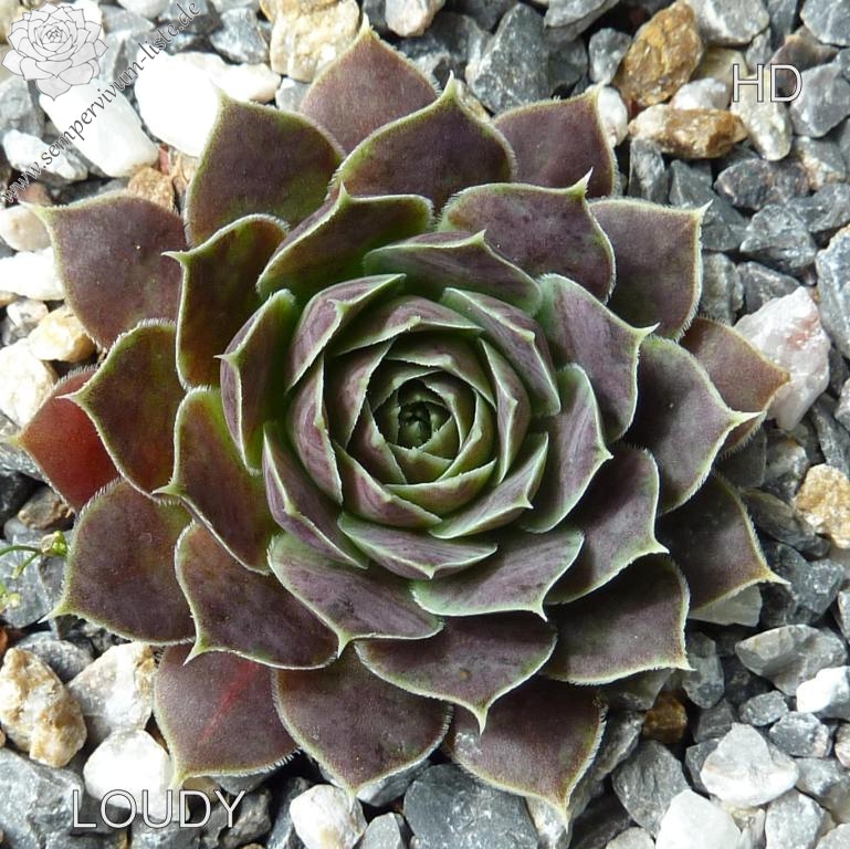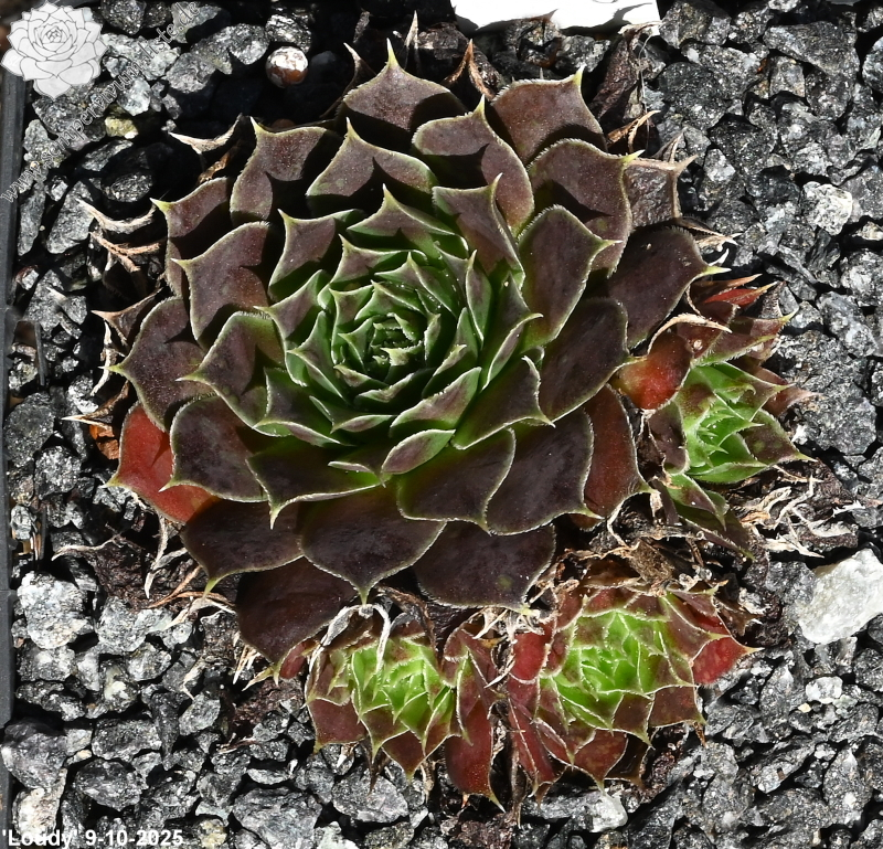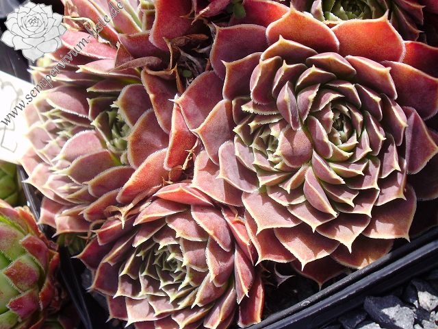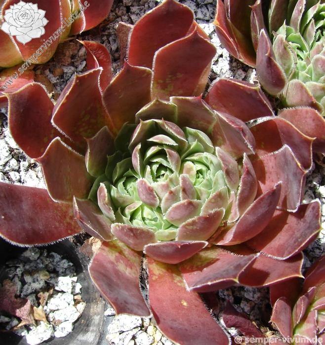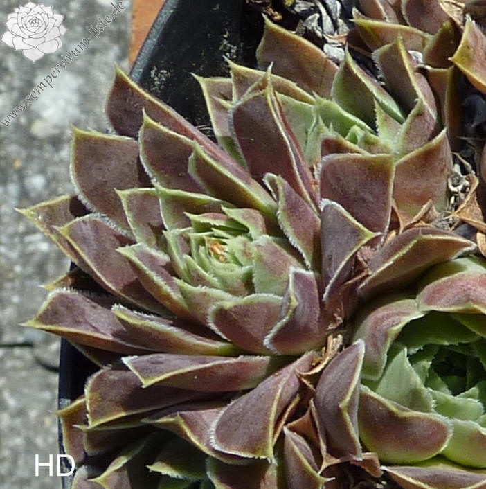 Kleinere Rosetten mit breitlanzettlichen Blättern in Mischfarben von Purpurrot, Violett und grauem Olivgrün.