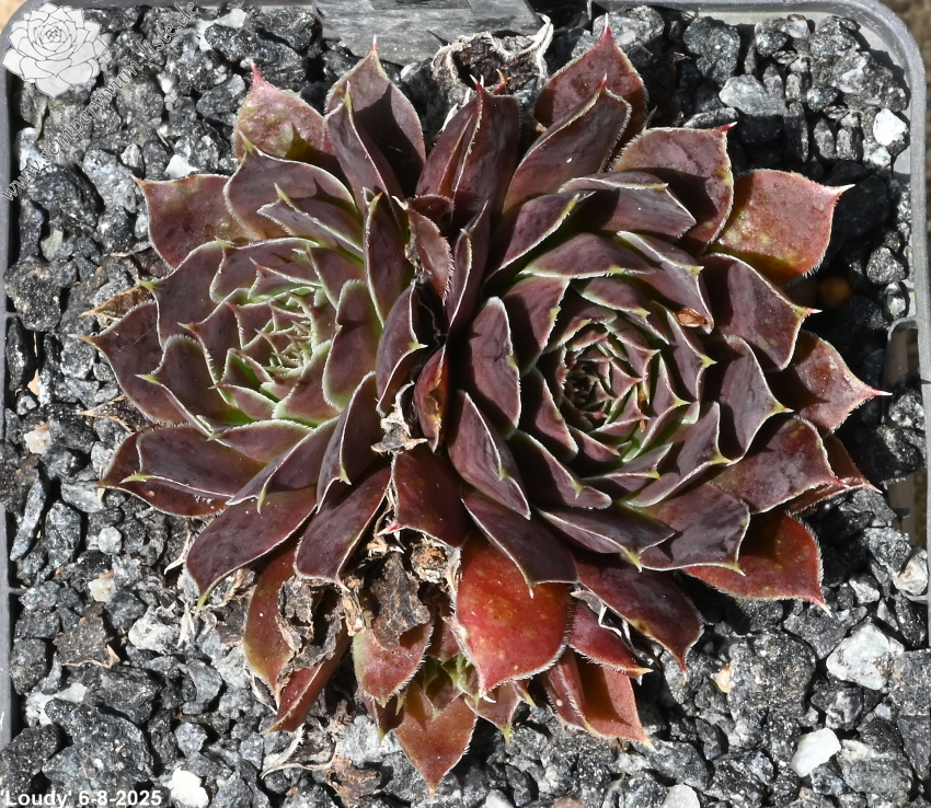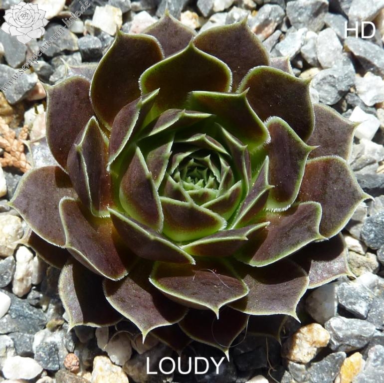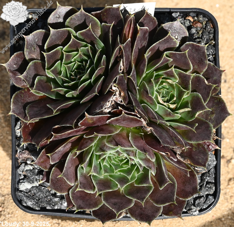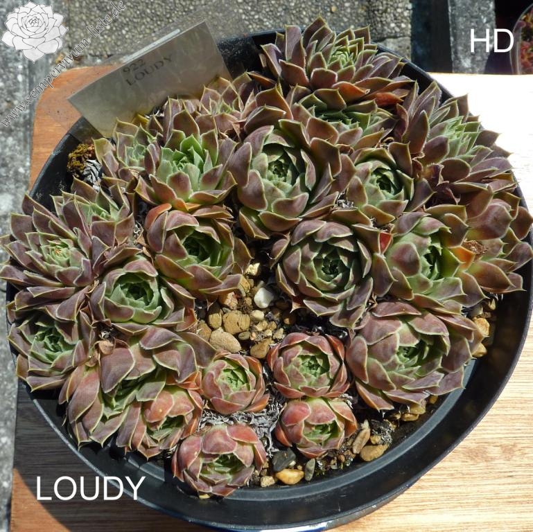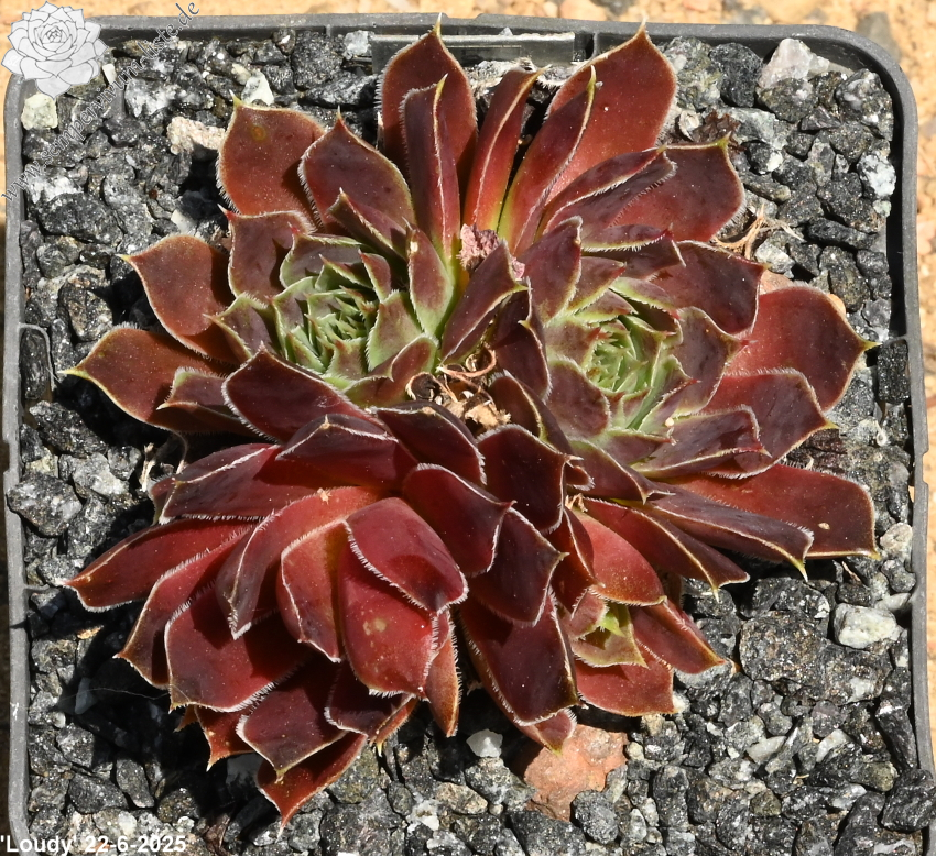 Kleinere Rosetten mit breitlanzettlichen Blättern in Mischfarben von Purpurrot, Violett und grauem Olivgrün.