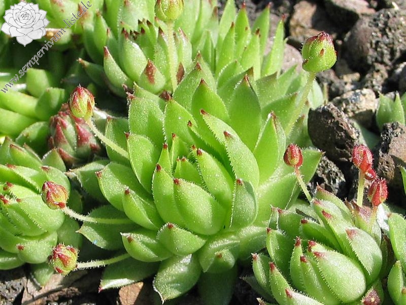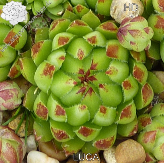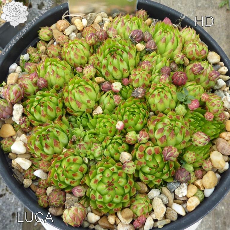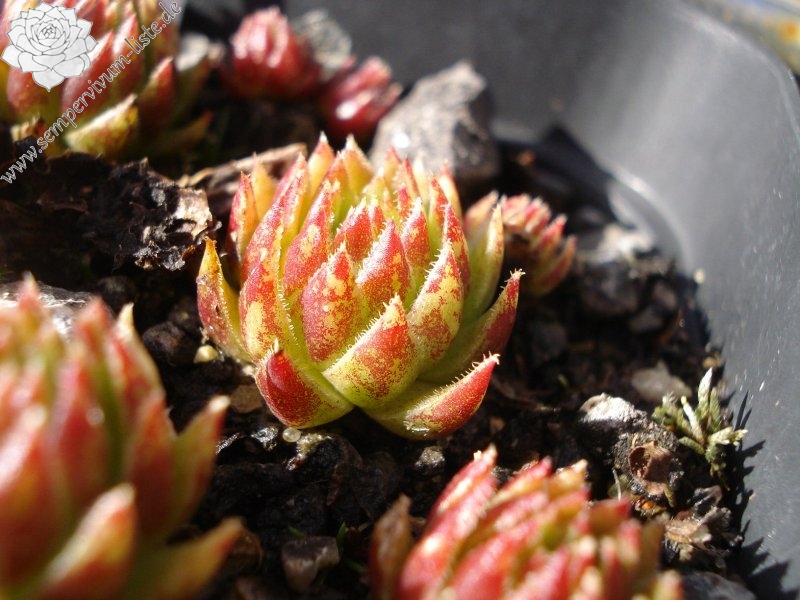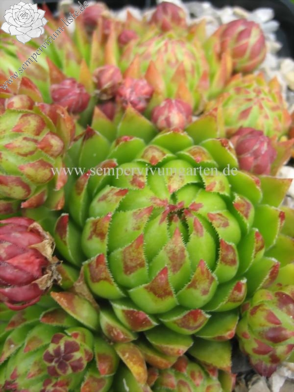 Apfelgrüne Rosetten mit spitzem Laub und orange-rosafarbenen Blattenden. Eine belgische Auslese von 2002.