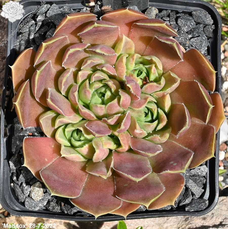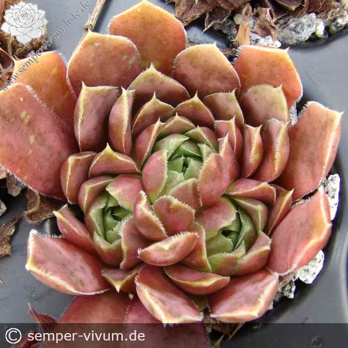 Eine wüchsigere Sorte mit mittelgroße Rosetten in pastellfarbenem Orange-Rosa.