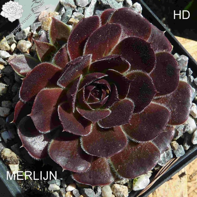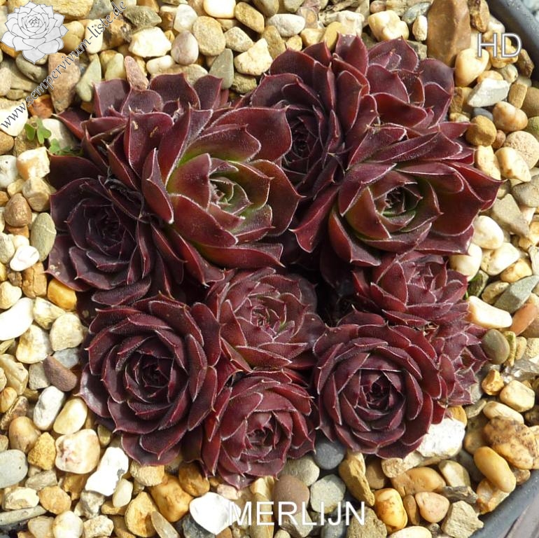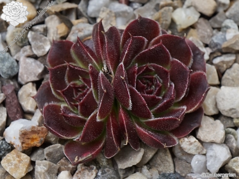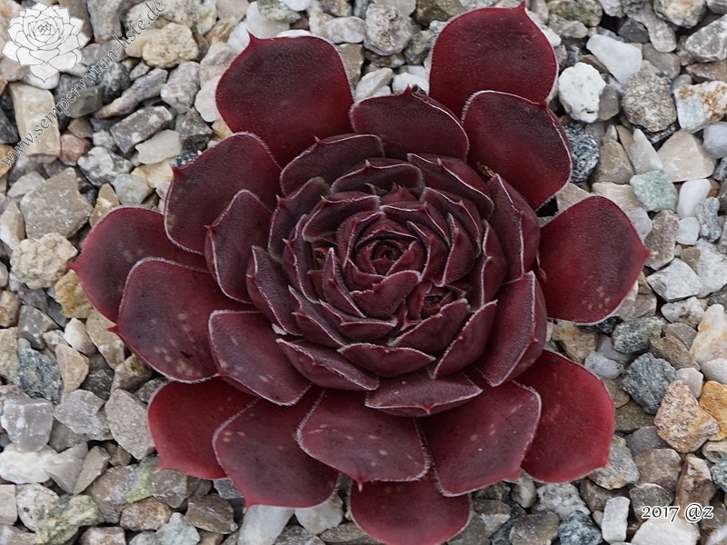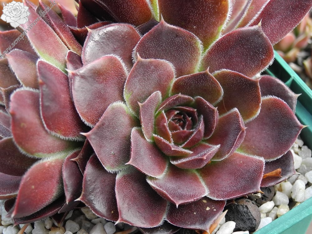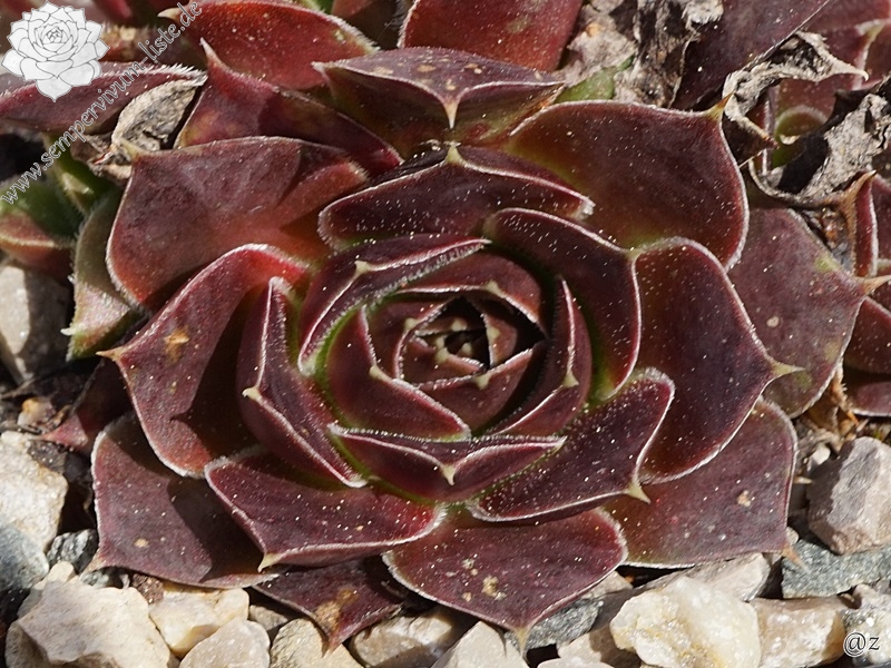 kleine Rosetten, Blätter breit keilförmig, kurz bespitzt, purpurrot - weinrot, Blattränder leicht bewimpert
