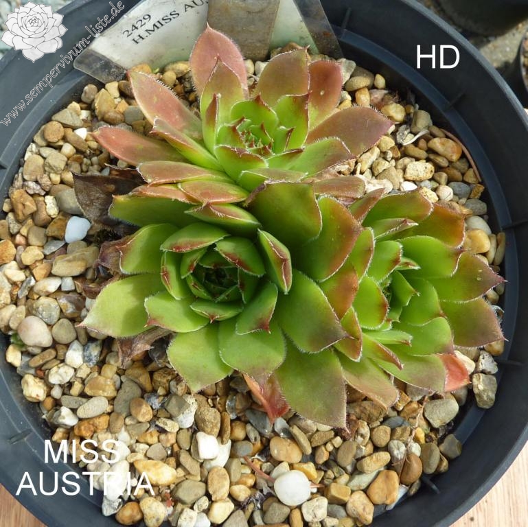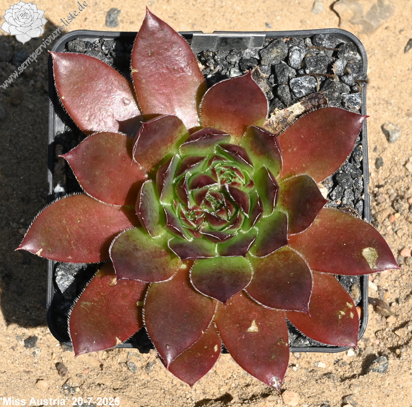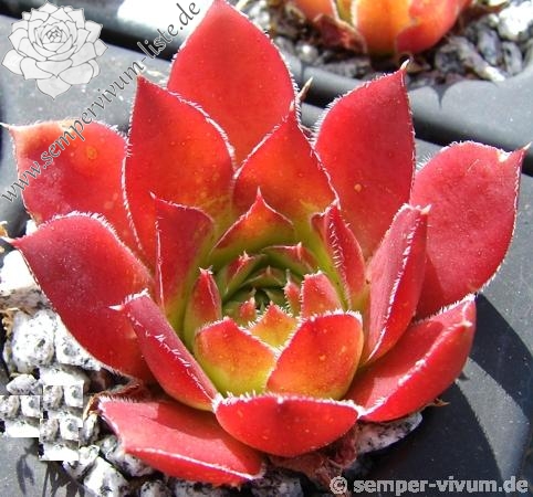 Eine deutsche Sorte mit rotbrauner Färbung. Bei nährstoffärmeren Substrat mit wenig Feuchtigkeit strahlen die Rosetten in leuchtendem Karminrot. Ähnlich der der Züchtung S. heuffelii 'Jovi King' aus den Niederlanden.