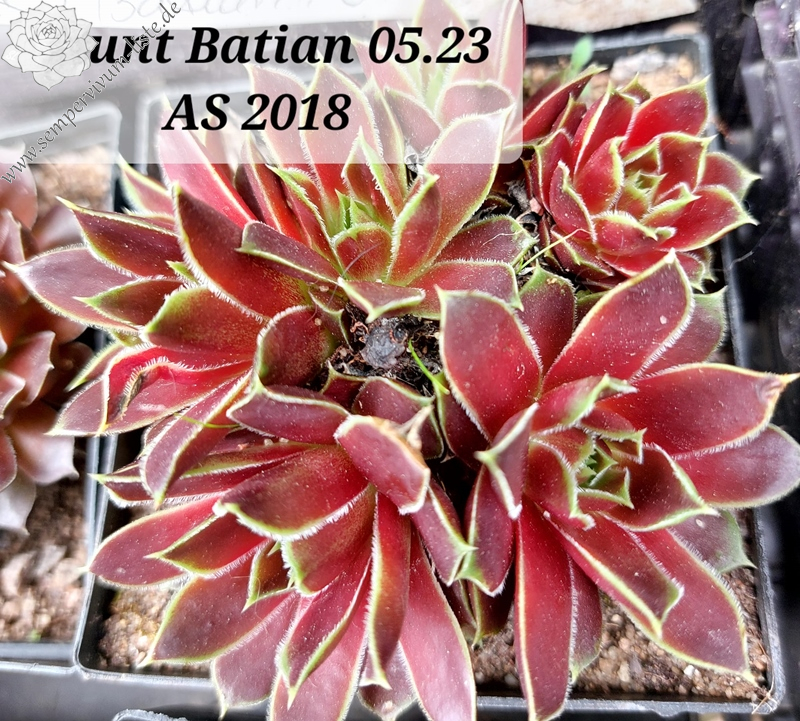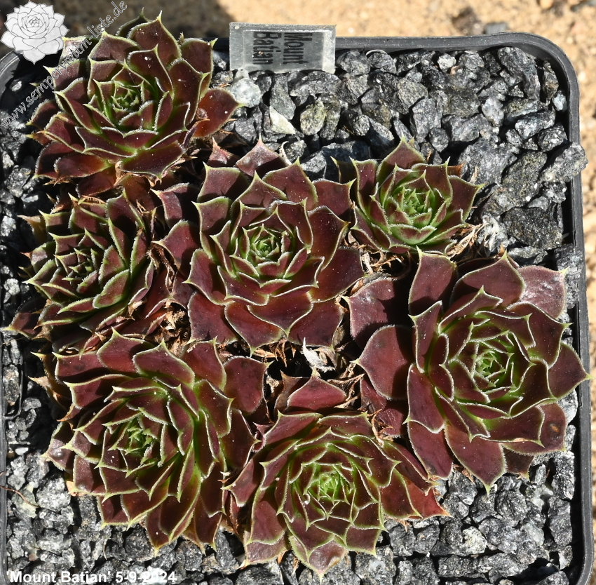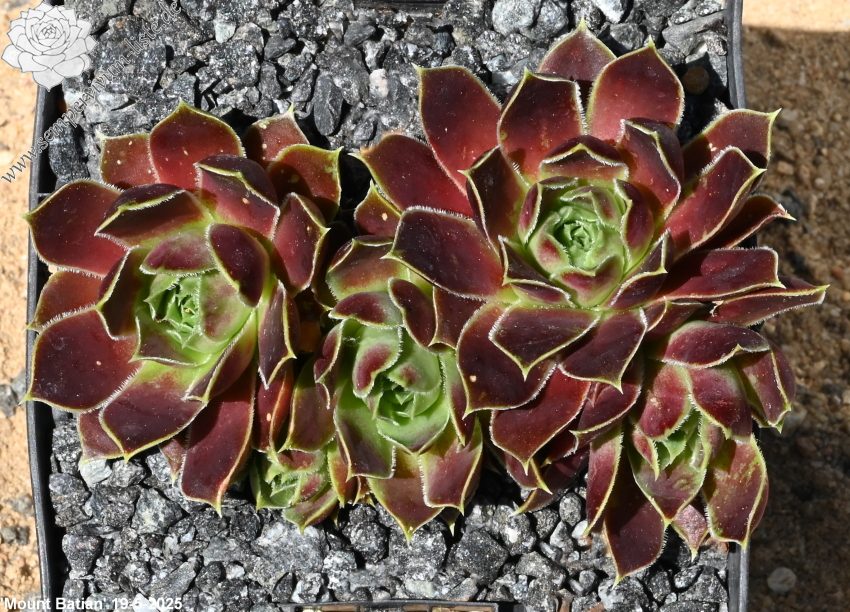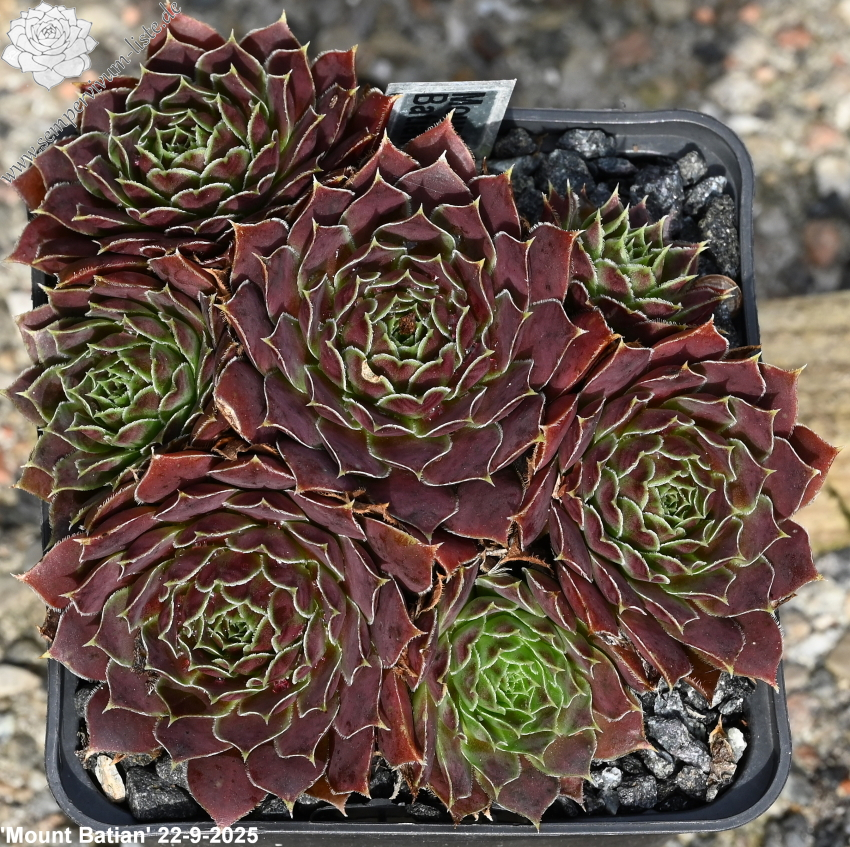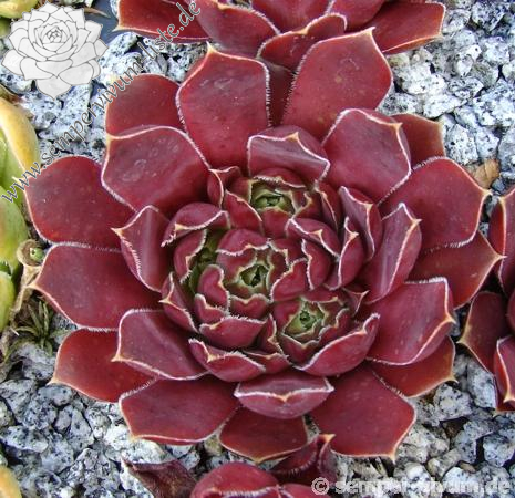 kleine Rosetten, Blätter oval, lang bespitzt, braunrot - weinrot, Herz hellgrün, Blattränder grünlich