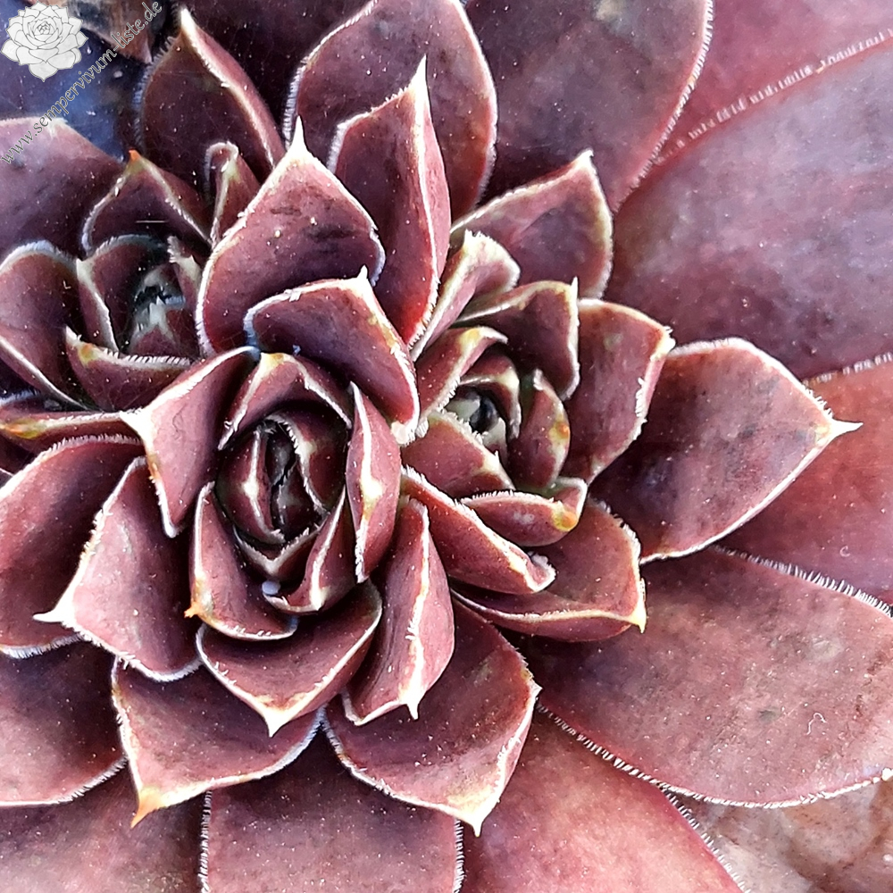 Rosetten bis 5 cm, Blätter linealisch, lang bespitzt, rubinrot - purpurrot, Blattränder hell
