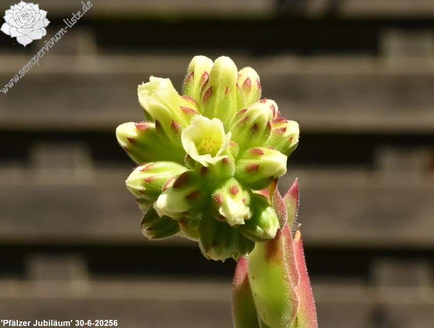Rosetten bis 5 cm, Blätter rundlich, kurz bespitzt, Basis hellolivgrün, obere Blattdrittel braunrot - oxidrot