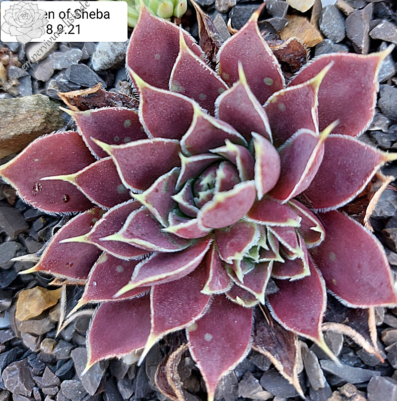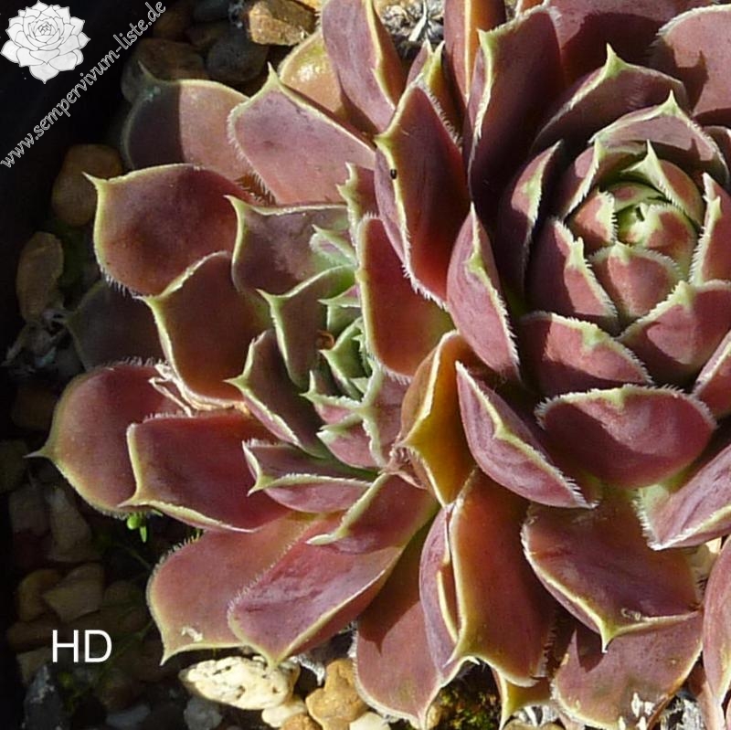 große Rosetten, Blätter spatelig, lang bespitzt, trübes Weinrot, Blattränder hell