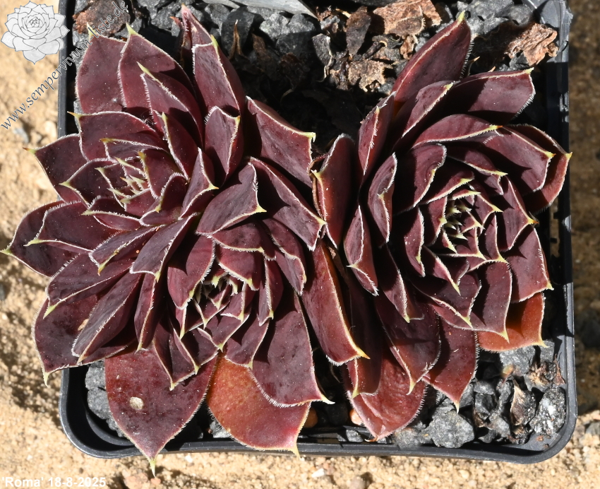 Rosetten bis 6 cm, Blätter oval, lang bespitzt, bordeauxviolett, Blattränder hell, bewimpert