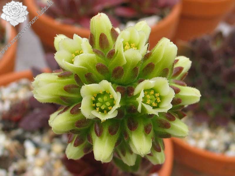 Die festen Rosetten bilden dichte Polster und vermehren sich willig. Leider ist die Vermehrung bei Jovibarba heuffelii aufwändiger und langwieriger als bei Sempervivum. Die Blüten sind hellgelb und typisch für Jovibarba heuffelii. Endlich können wir wenige Rosetten anbieten