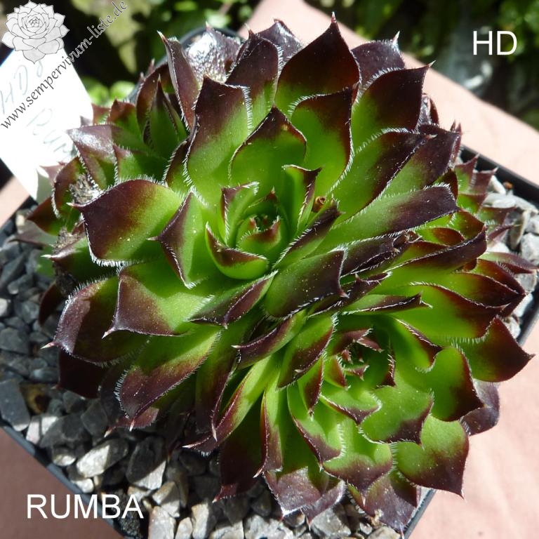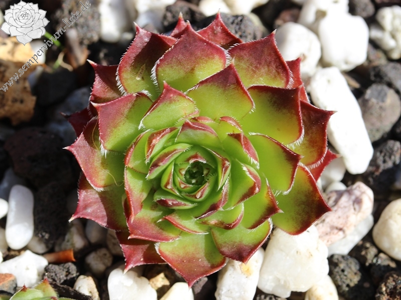 Rosetten bis 7 cm, Blätter lanzettlich, lang bespitzt, helles gelb - grün mit kräftig dunkel rot - kastanienbraunen Spitzen, Blättränder silbern bewimpert, Zufallssämling, Aussaat 1999