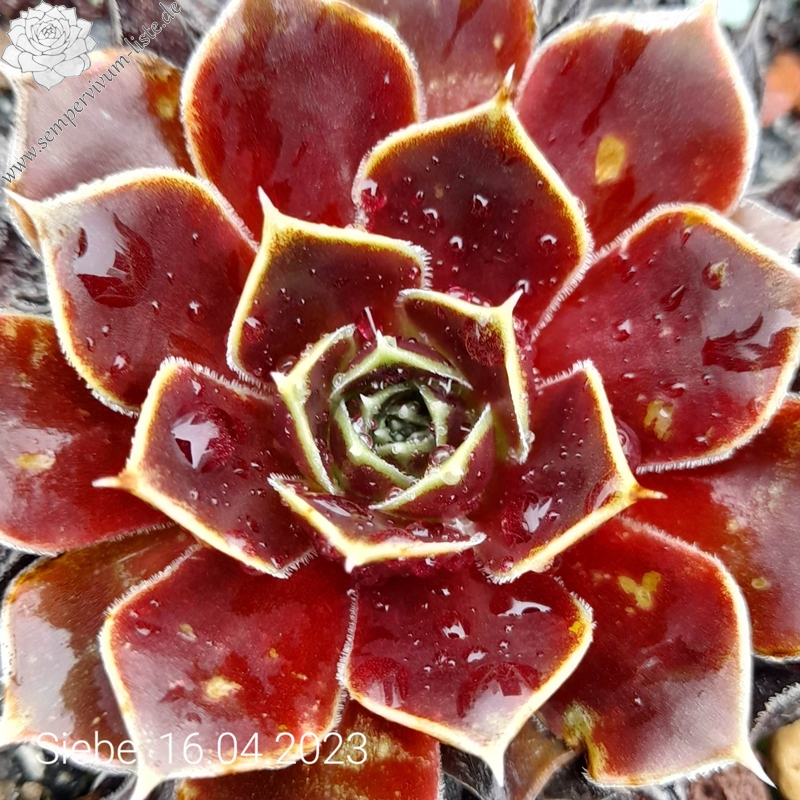Rosetten bis 5 cm, Blätter oval, lang bespitzt, lachsrot - altrosa, Blattränder gelb