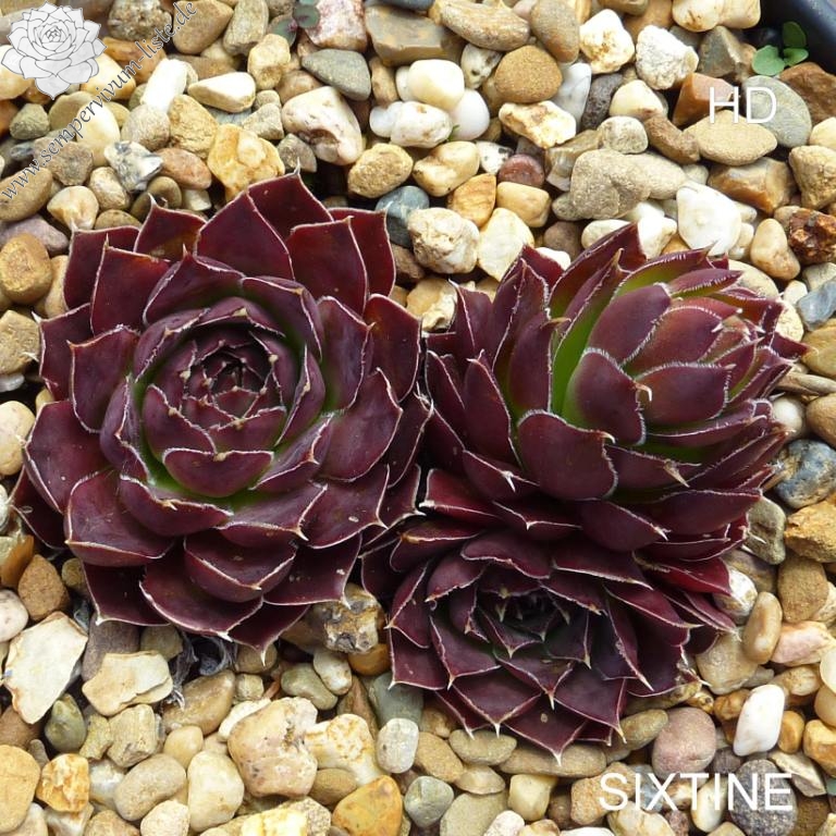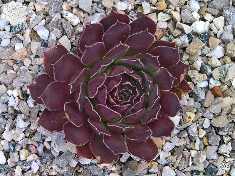 Rosetten bis 5 cm, Blätter kurz lanzettlich, lang bespitzt, bordeauxviolett, Blattränder bewimpert