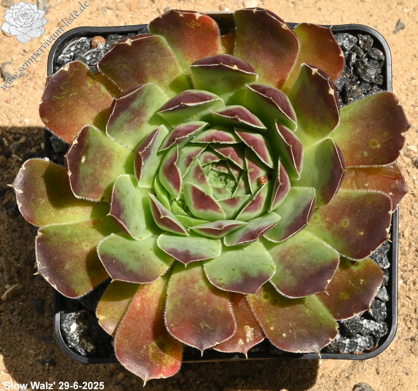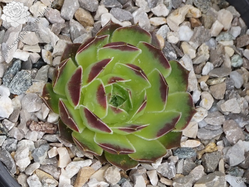 Rosetten bis 8 cm, Blätter breit spatelig, kurz bespitzt, Basis helles Grün, obere Blattdrittel oxidrot - braunrot, Zufallssämling