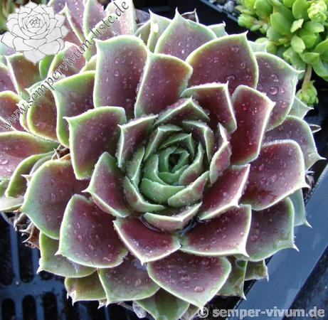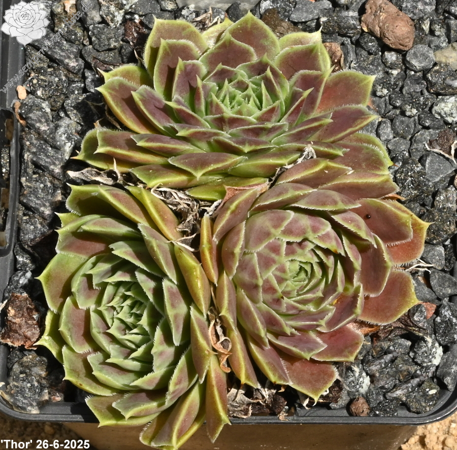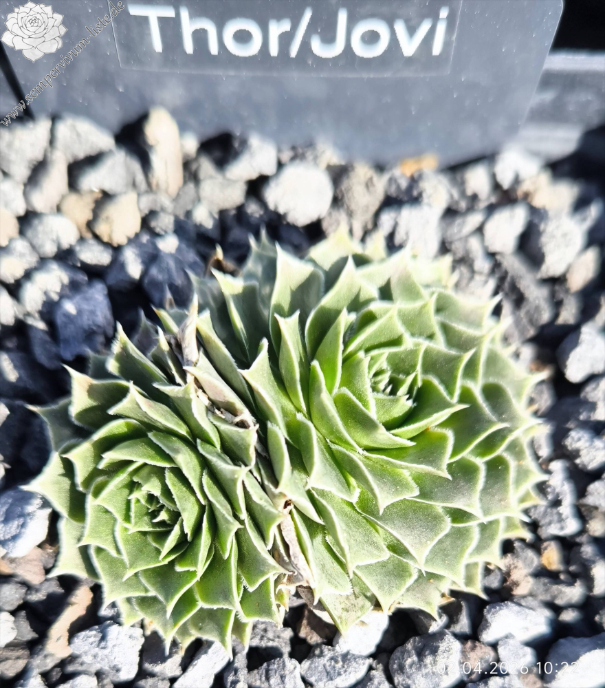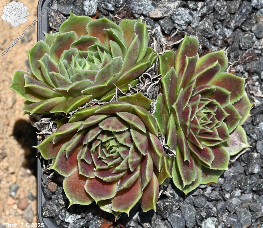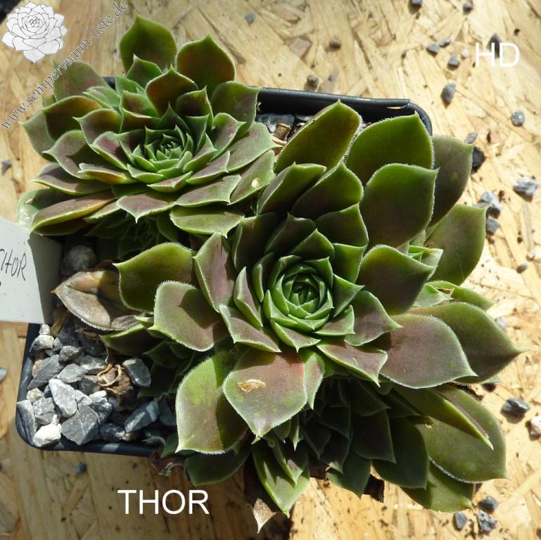 Diesen Zufallssämling vermehren wir nun seit fünf Jahren und er hat uns sehr von seiner Größe beeindruckt. Im Frühjahr schmücken sich die Blätter mit violett-rosa Farbe, dazu ein hellgrüner Rand. Später verwandeln sich die Töne in helles Violett. Benannt haben wir diesen Donarsbart nach dem Gewitter- und Wettergott "Donar", der in der altnordischen Sagenwelt als "Thor" überliefert wird. In den mythologischen Schriften hatte er in der Menschenwelt auch die Aufgabe des Beschützers. Den volkstümlichen Namen erhielt der Donarsbart jedoch vom Donnergott Jupiter, wovon auch der Name Jupiterbart abgeleitet wird. 'Thor' ist nicht ganz so wüchsig wie 'Pink Rainbow' und ist daher nur in geringerer Stückzahl lieferbar.