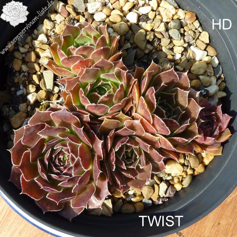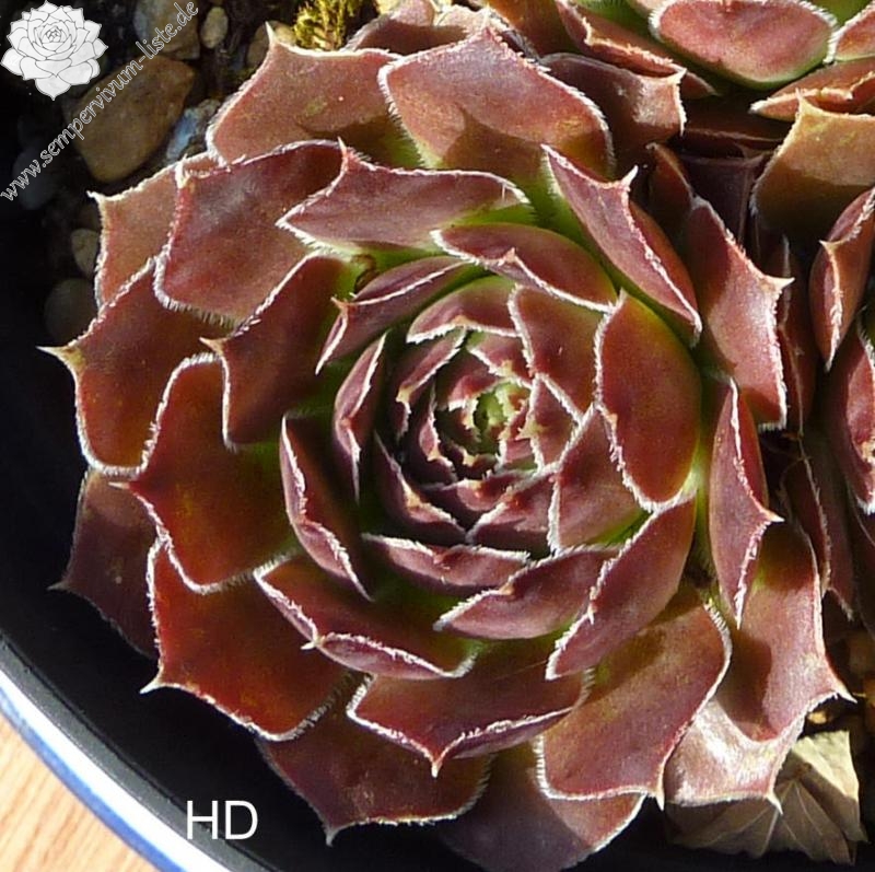 große Rosetten, Blätter keilförmig, kurz bespitzt, dunkelbraun - rot, Ränder bewimpert