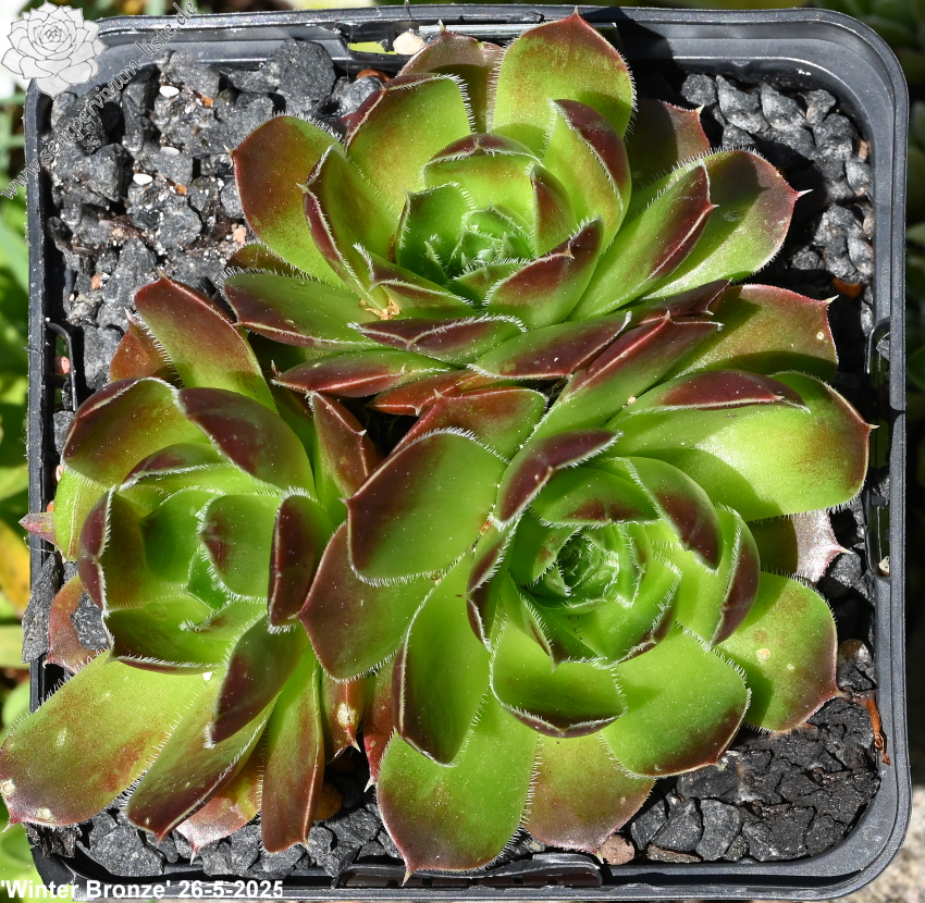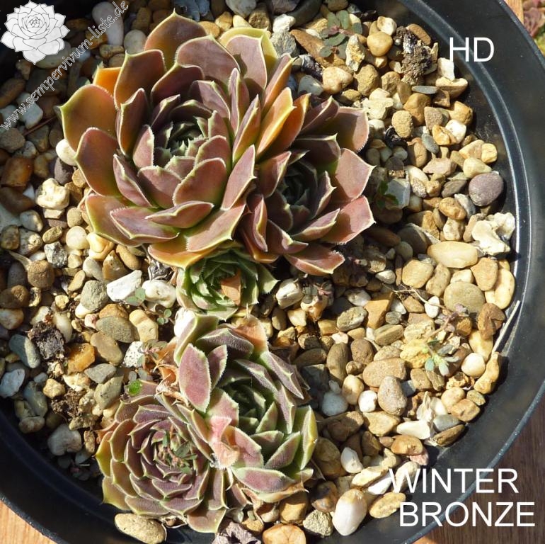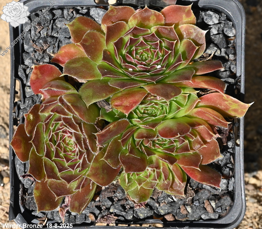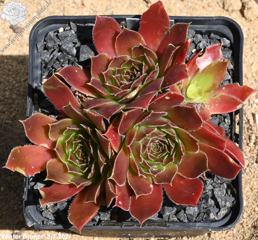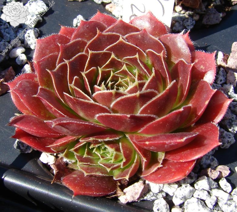 Bei dieser bildhübschen Sorte ist nicht geklärt, ob sie evtl. ein "Kuckucks"-Donarsbart ist. Es ist nämlich noch ein weiterer Klon bekannt. Vom Namen gerührt, würde der zweite besser zur Färbung passen. Dennoch haben wir die Pflanze in unserem Sortiment vom Züchter erhalten. Er formt mittelgroße Rosetten in Karminrot. Vielleicht ein Sämling, der sich im Topf der echten S. heuffelii 'Winter Bronze' eingenistet hat? Wir kennen ihn nur von Bildern und es scheint, er wäre nicht sehr wüchsig und evtl. sogar bei Nässe empfindlich in Kultur.