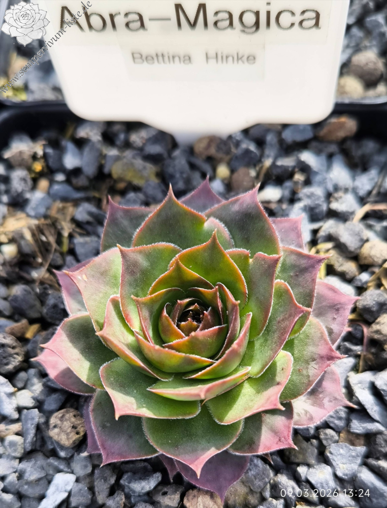 'Abra-Magica' hat kompakte, bis zu 6 cm groß werdende Rosetten mit glänzenden, rundlichen Blättern, die am Ende sehr schnell ganz spitz zulaufen. Über das gesamte Jahr ist die Hauptfarbe überwiegend grün. Nur die Farbe des Blattrandes verändert sich vom Frühjahr, wo er etwas breiter, in einem Gemisch von Braun und Gelb erscheint und zum Sommer hin schmaler wird und ein dunkles Braun annimmt. Mit zunehmender Sonneneinwirkung verblasst der Rand, so daß nur noch dunkle Spitzen zu sehen sind, die dann auch immer heller werden. Im Spätsommer erscheint die kompakte Mitte in einem leichten Lila.