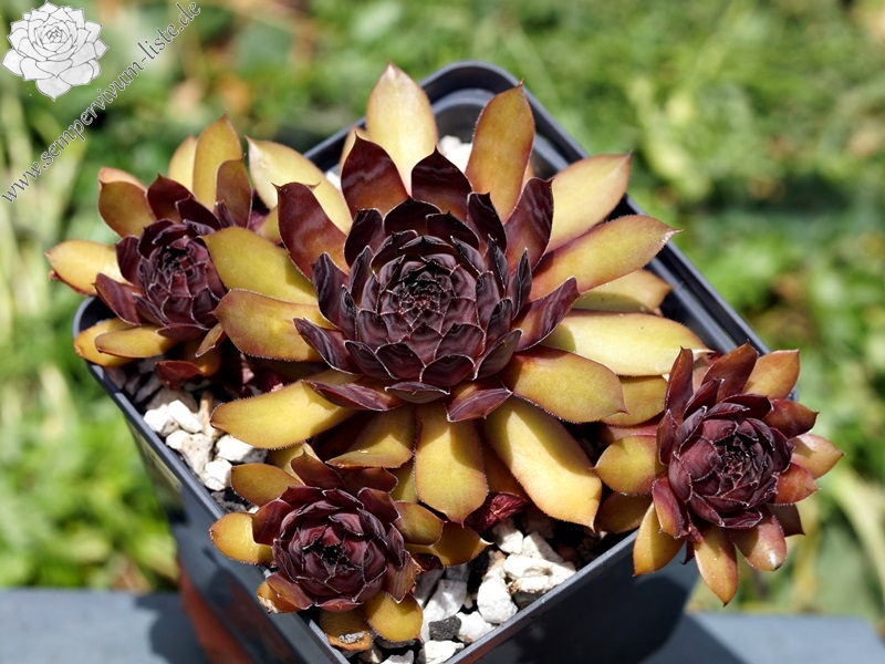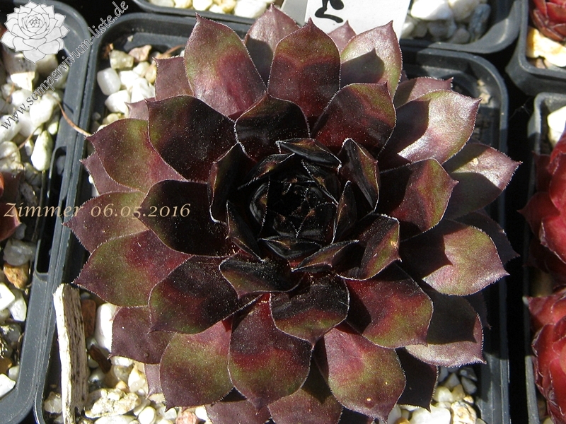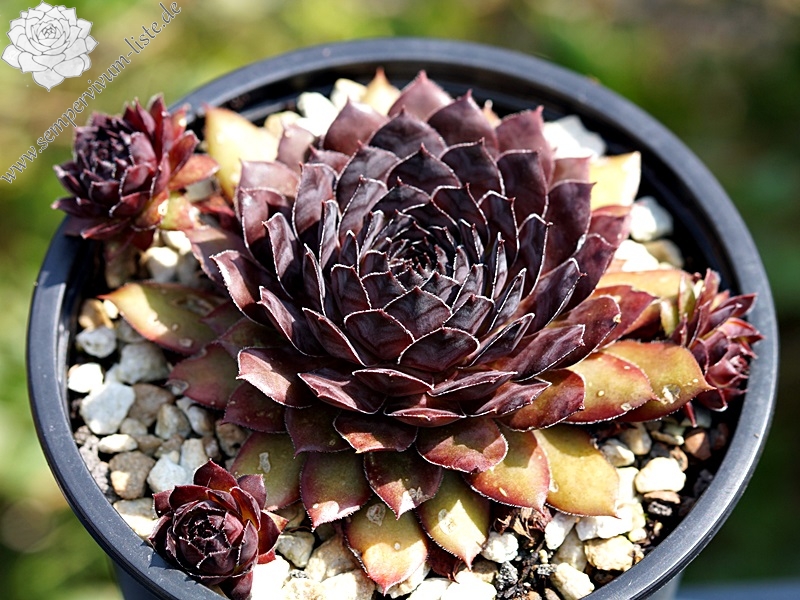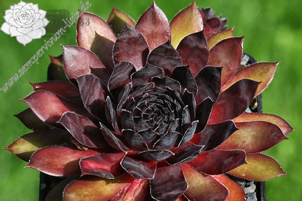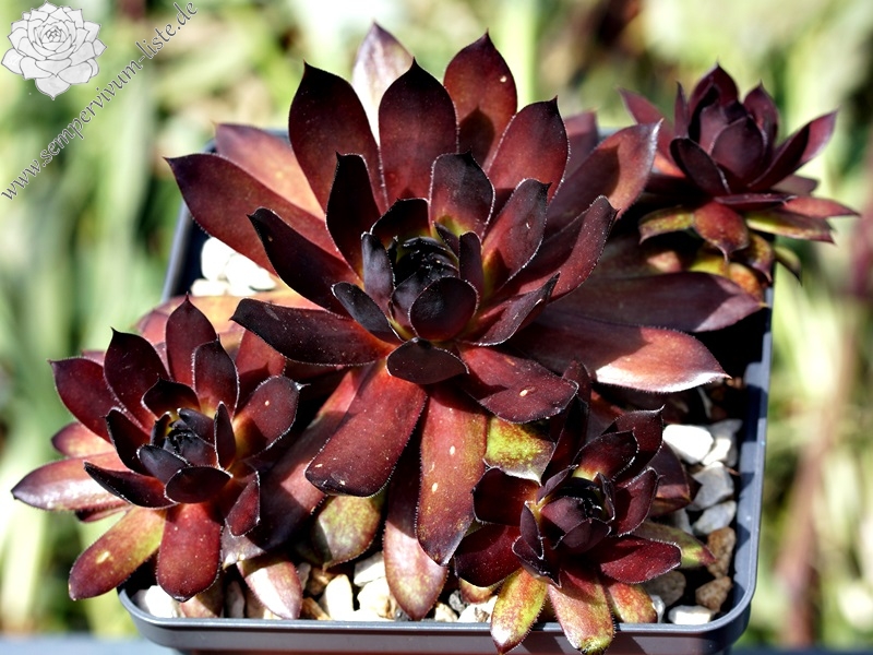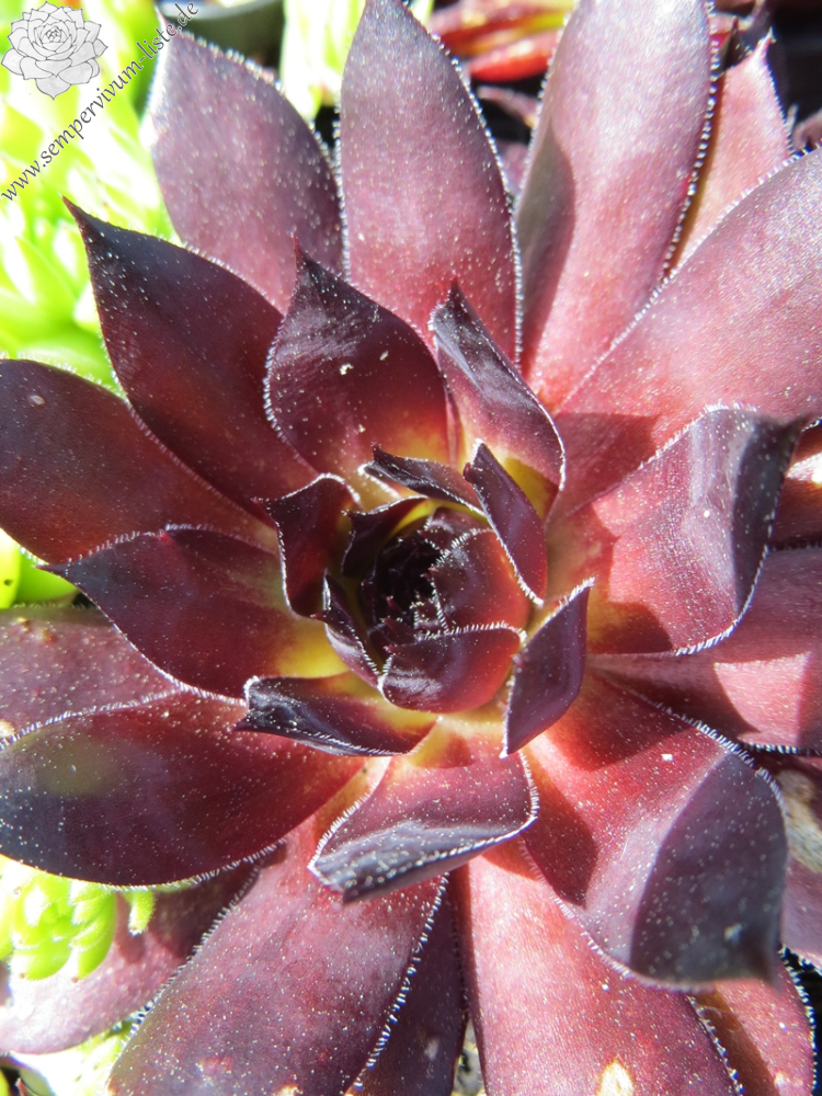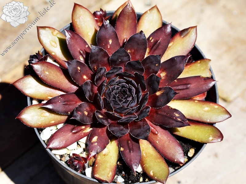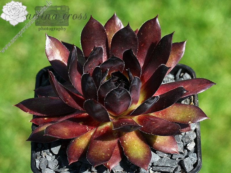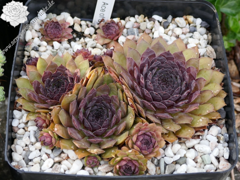 Sempervivum 'Ace of Spades' startet mit sehr dunkel gefärbt Rosetten. Die Rosetten erreichen einen Durchmesser von ca. 9cm und sprossen willig. Im Sommer hellen die äußeren Blattränder deutlich auf und zeigen fast gelbliche Farben. Es handelt sich um eine sehr robuste Züchtung.