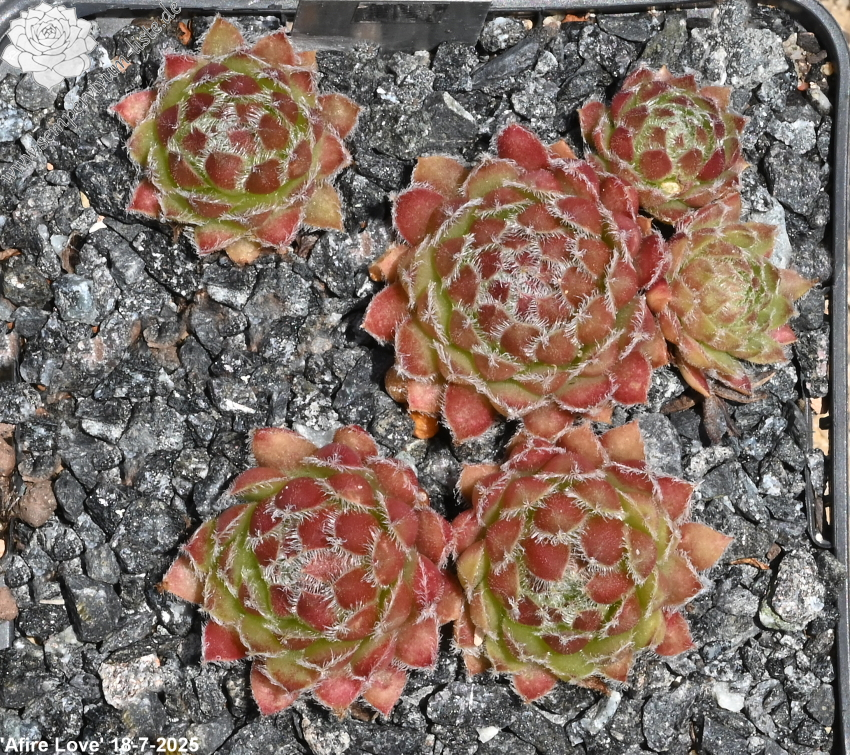 Eine besonders intensive karminrote Färbung zeigt 'Afire Love' von Mai bis Juni, wobei hier die Behaarung und Bewimperung der Blattränder und Spitzen sehr auffällig ist. Auch am Blattrücken sitzen zur Spitze während dieser Zeit weiße Haare, die bei Sonnenlicht silbrig erscheinen. Der Zufallssämling hat mit dieser Eigenschaft vermutlich Gene von S. ciliosum im Blut, wobei er ja auch in der Nähe einer F1-Hybride dieser Art gefunden wurde. Im Sommer mischen sich lachsrosa- und bronzerote Töne unter, während die mittelgroßen Rosetten im Herbst noch einmal mit einer interessanten Form und sehr unterschiedlicher Färbung in Olivgrün und Bronze mit Rosa aufwarten.