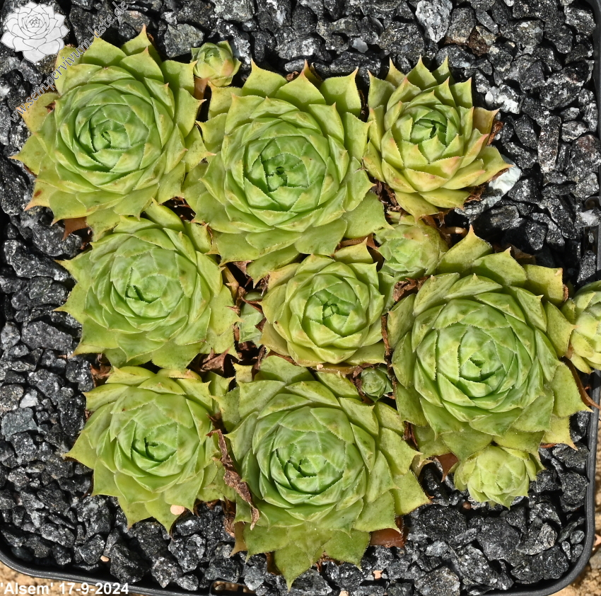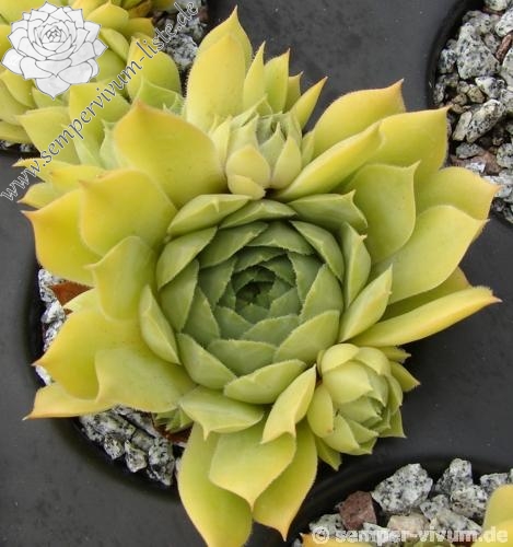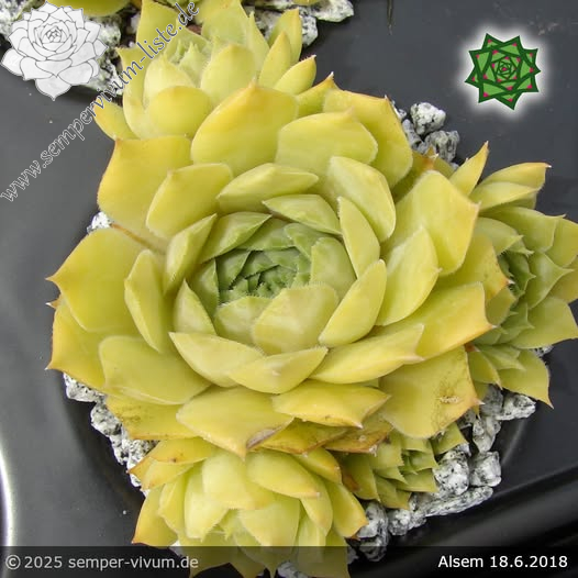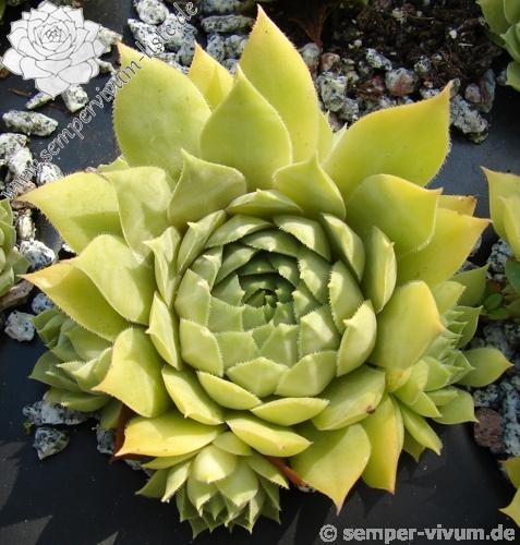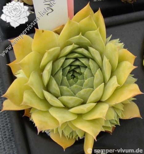 Ein interessanter Hauswurz mit gelblichen Nuancen in ganzjähriger Färbung. Er stammt von Johan Vroom aus den Niederlanden. Diese bislang kaum bekannte Hybride ist eine Auslese aus Sämlingen einer Kreuzung der Sorte 'Ernest Hepworth' mit einer Unbekannten. Insgesamt zeigen die mittelgroßen Rosetten kaum Unterschied während des Jahres: Ein zartes Jadegrün mit gelben Pigmenten.