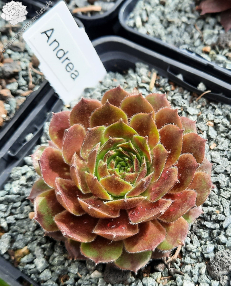 Zufälligerweise erfuhr ich, dass einige Sammlerinnen mit dem Namen Andrea es bedauerten, ihren Namen nicht auch als Sempervivum in ihren Sammlungen zu haben, es gab ihn noch nicht. Dem konnte Abhilfe geschaffen werden und aufgrund seiner strahlenden Schönheit hatte er meiner Meinung nach einen ebensolchen Frauennamen verdient.