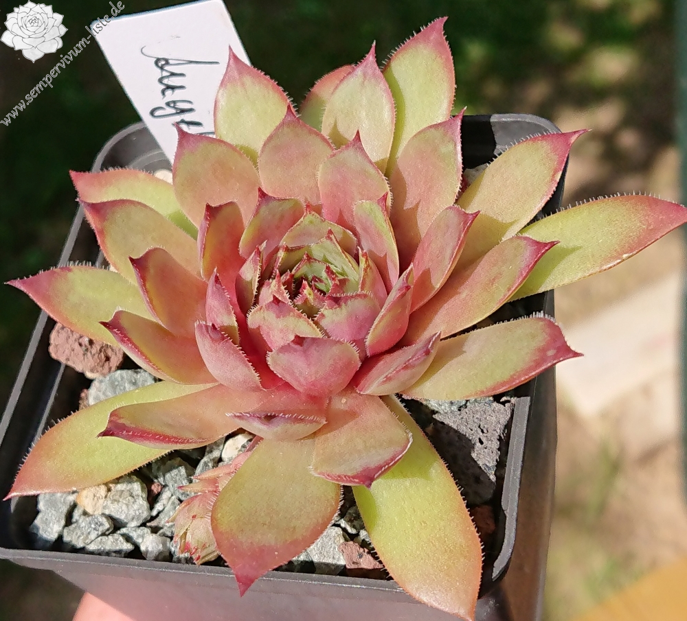 Rosetten bis 6 cm, Blätter lanzettlich, lang bespitzt, trübes Rot mit dunklen Spitzen