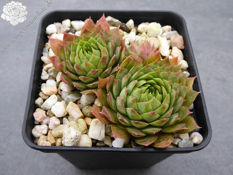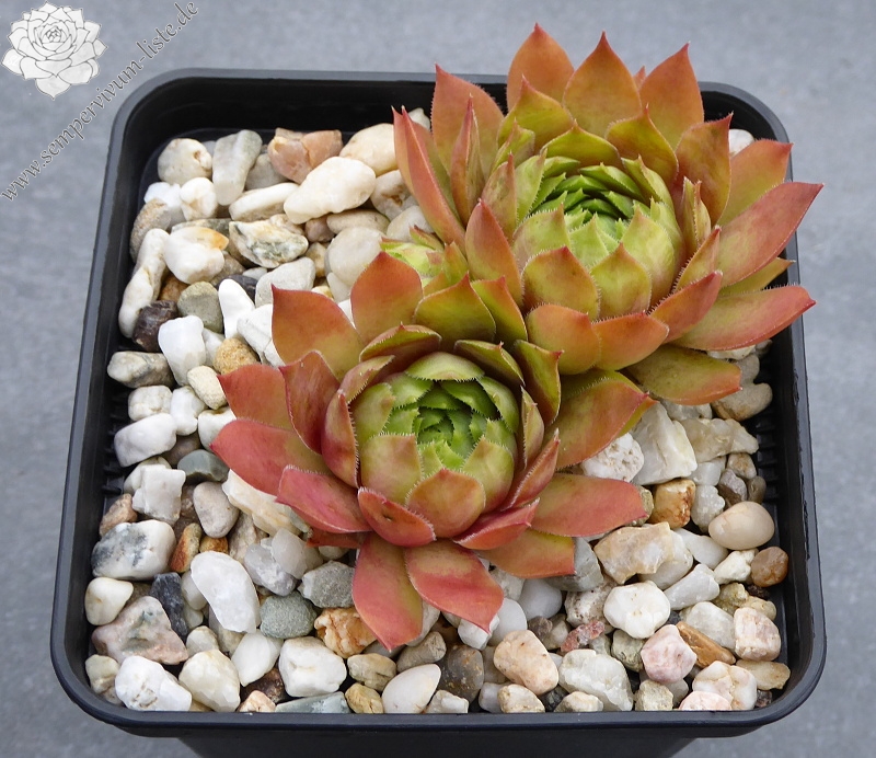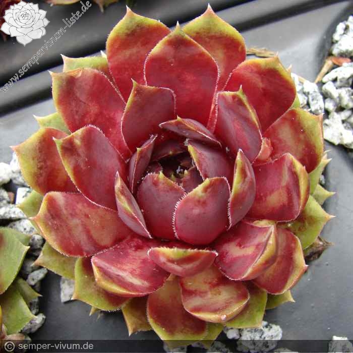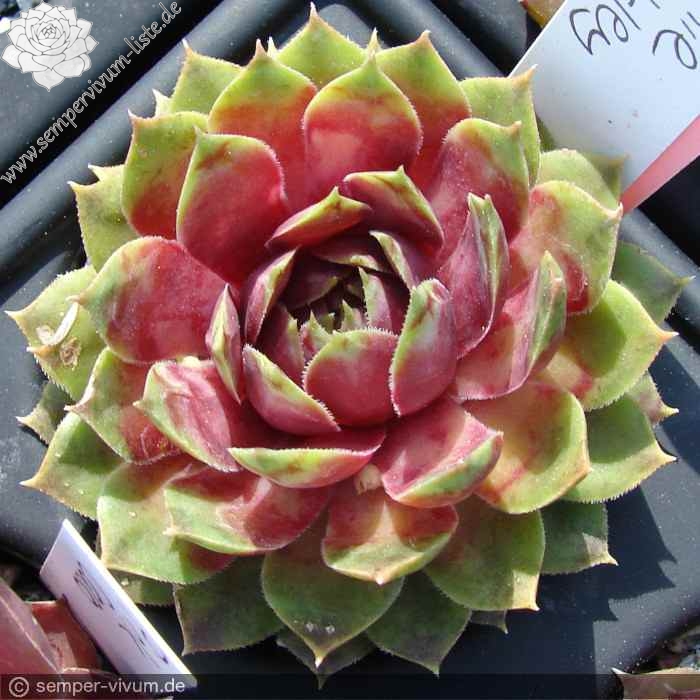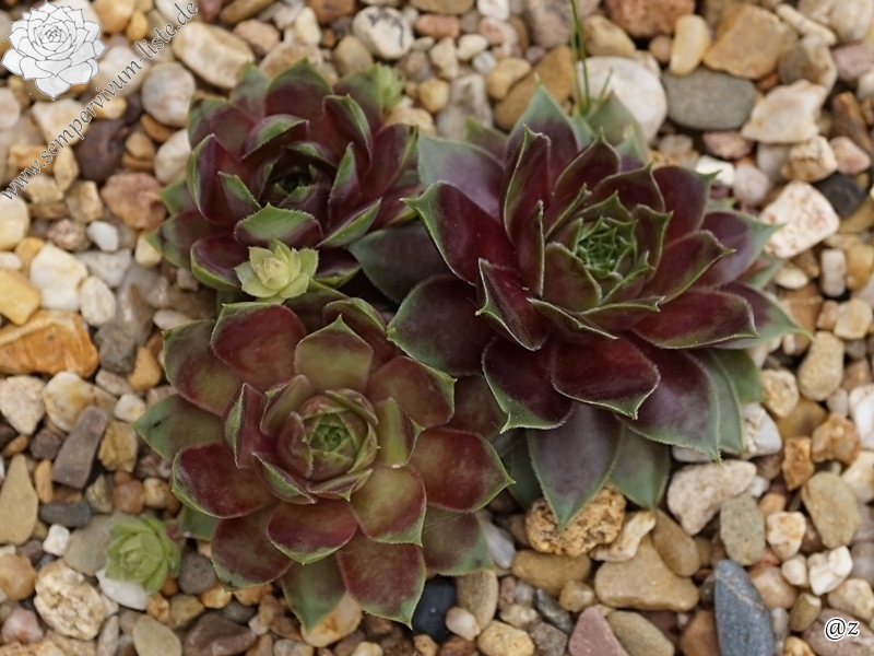 Rosetten bis 6 cm, Blätter oval, lang bespitzt, weinrot, äußere Blätter hellgrün