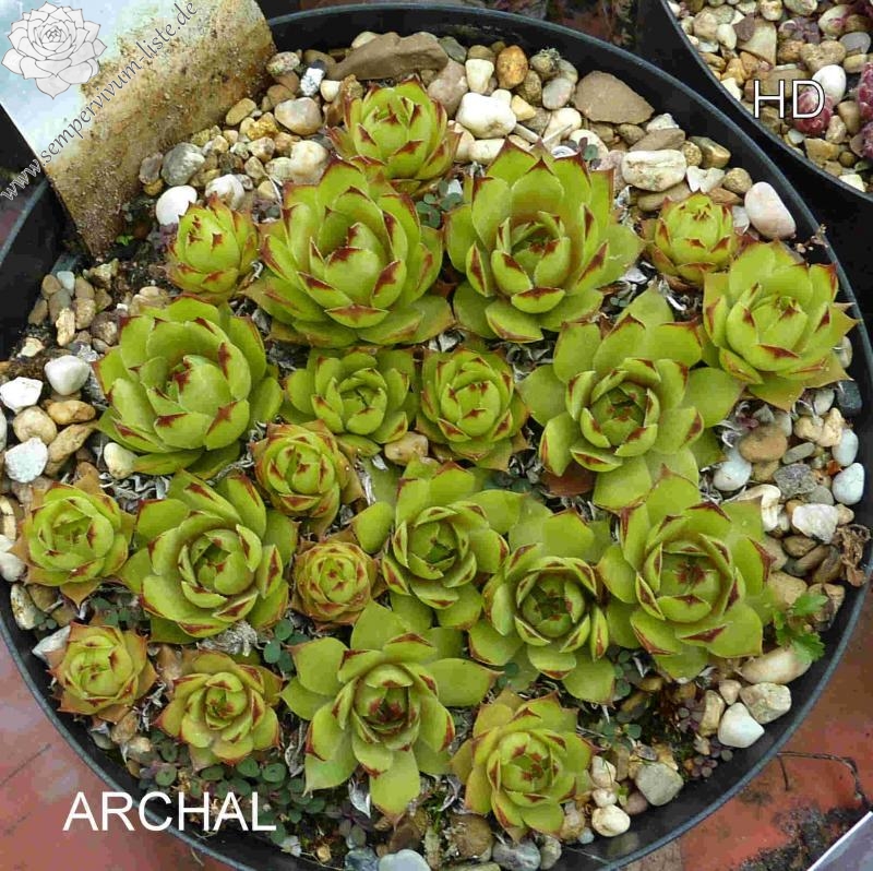 Es handelt sich hierbei um eine S. tectorum ähnliche Hybride mit leicht gelblichen Nuancen. S. cv. Archal ist eine Züchtung der 90er Jahre und stammt aus Belgien.