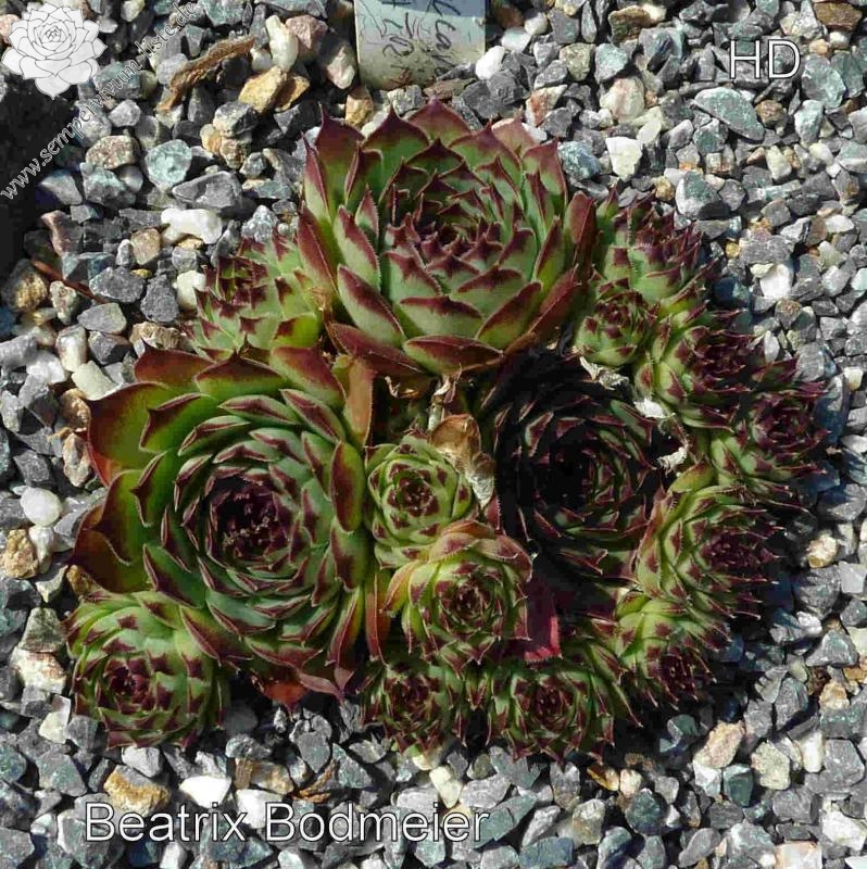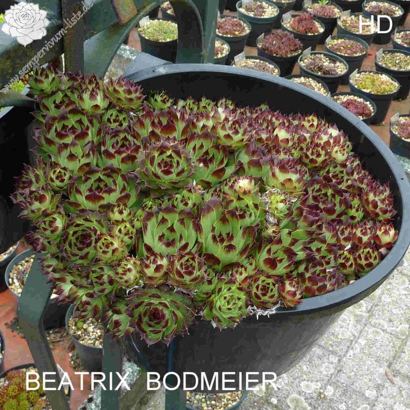 Sempervivum 'Beatrix Bodmeier' ist ein wüchsiger Hauswurz, der dichte Polster bildet. Die mittelgroßen, grünen Rosetten erreichen einen Durchmesser von 7cm und zeigen rund ums Jahr die hellgrüne Färbung. Die dunkelroten Blattenden sind je nach Jahreszeit unterschiedlich intensiv gefärbt. Wie alle Sempervivum calcareum-Kultivare ist auch diese Züchtung von André Smits sehr robust und verträgt sehr gut heiße Sommer in Verbindung mit Trockenheit. Besonders bei feuchter Frühjahrswitterung sprossen die Pflanzen sehr willig. Die Blüten erscheinen nur selten.
